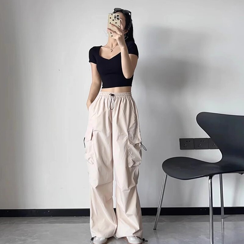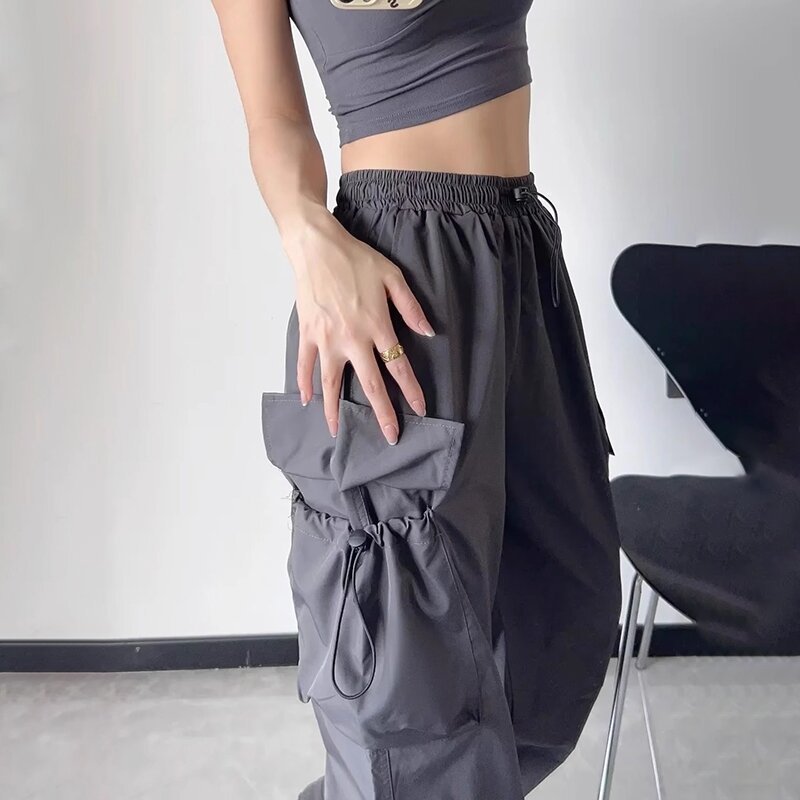 Celana kargo parasut serut wanita oversize kain tebal | wide leg Harajuku | streetwear cargo pants kain Highwaist