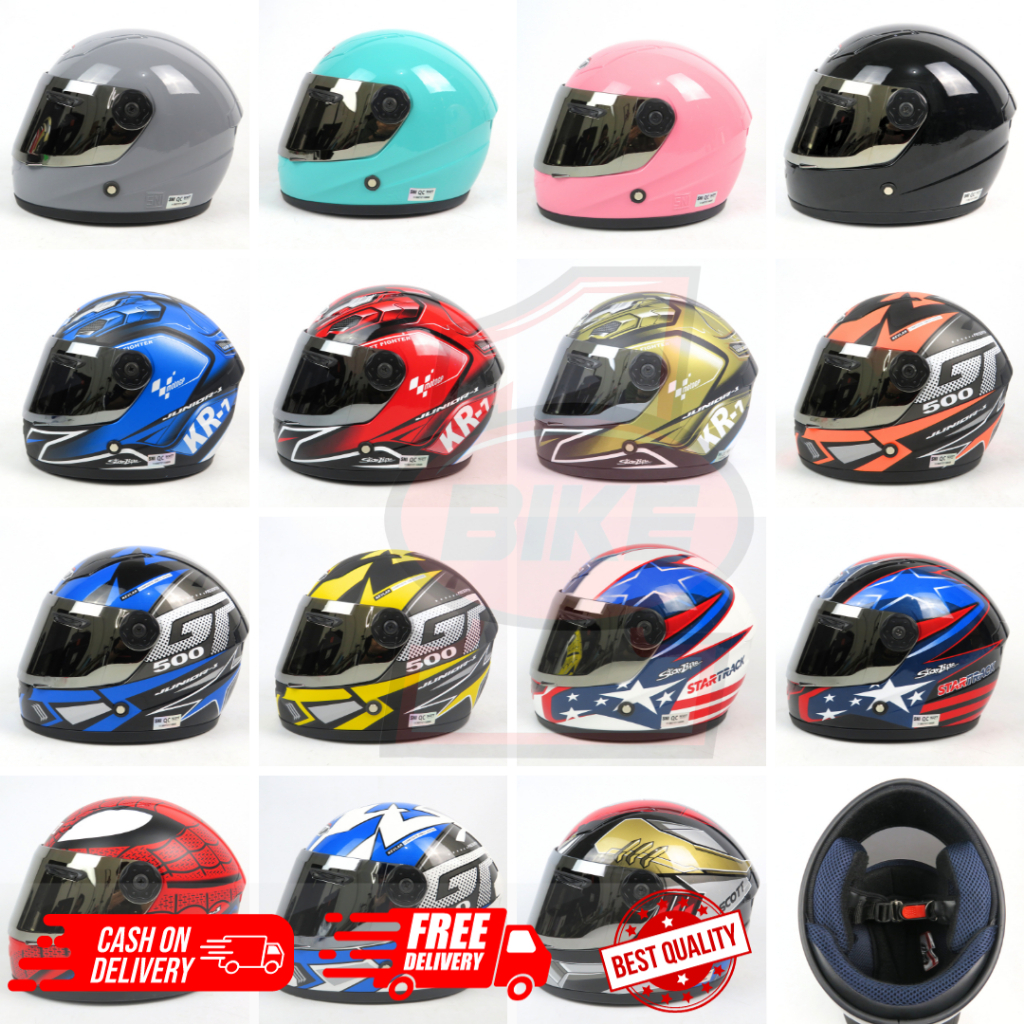 POLOS HITAM GLOSSY , POLOS HITAM DOFF, POLOS MERAH , POLOS PINK , POLOS CREAM, POLOS KUNING , POLOS GREY , POLOS BIRU, POLOS TOSCA , KAPTEN AMERIKA , BIRDY RACE, GUNDAM, IRON MAN , BLACK WOLVES, SPIDERMAN RED BLUE, STAR TRACK WHITE , STAR TRACK BLACK , GP 500 YELLOW BL, GP 500 BLUE BLACK, GP 500 BLACK GOLD , GP 500 WHITE RED, GP 500 WHITE BLUE , GP 500 YELLOW WHITE, AERODYN BLACK RED , AERODYNE BLUE BLACK, AERODYNE GOLD BLACK, AERODYN GOLD WHITE, PISTON BLACK BLUE , PISTON RED BLACK , M&M BLACK, M&M CREAM , VISOR SILVER , VISOR SMOKE , VISOR CLEAR POL, POLOS SAGE