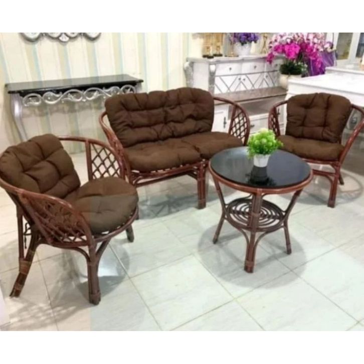 Kursi Bahama Classic Rotan Alami Set Bantal Dan Meja Kaca 1 Set / Kursi Teras Tamu Rotan Asli Minimalis