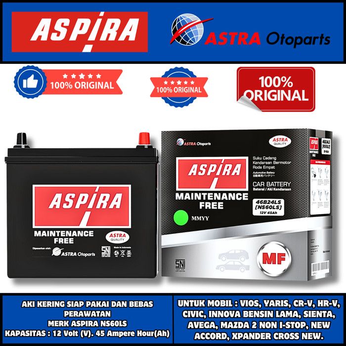 AKI MOBIL CIVIC , VIOS, SIENTA , YARIS , KIJANG INNOVA BENSIN , CRV , XPANDER NS60LS ASPIRA ASTRA MF AKI KERING ORIGINAL