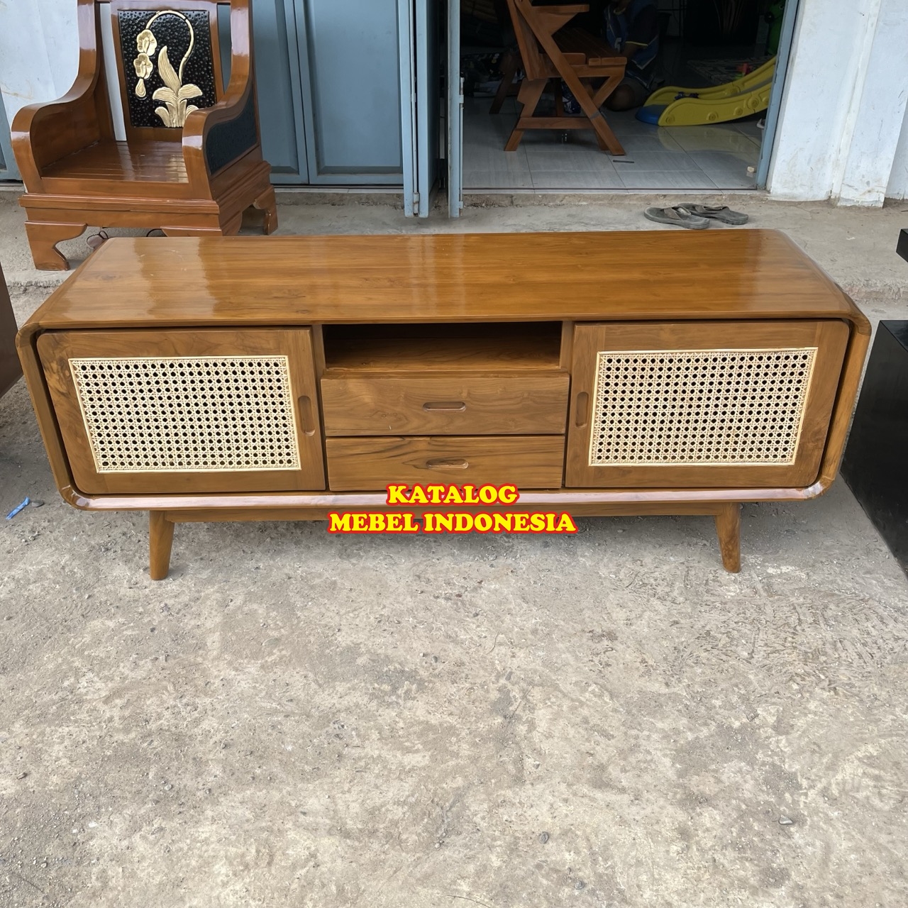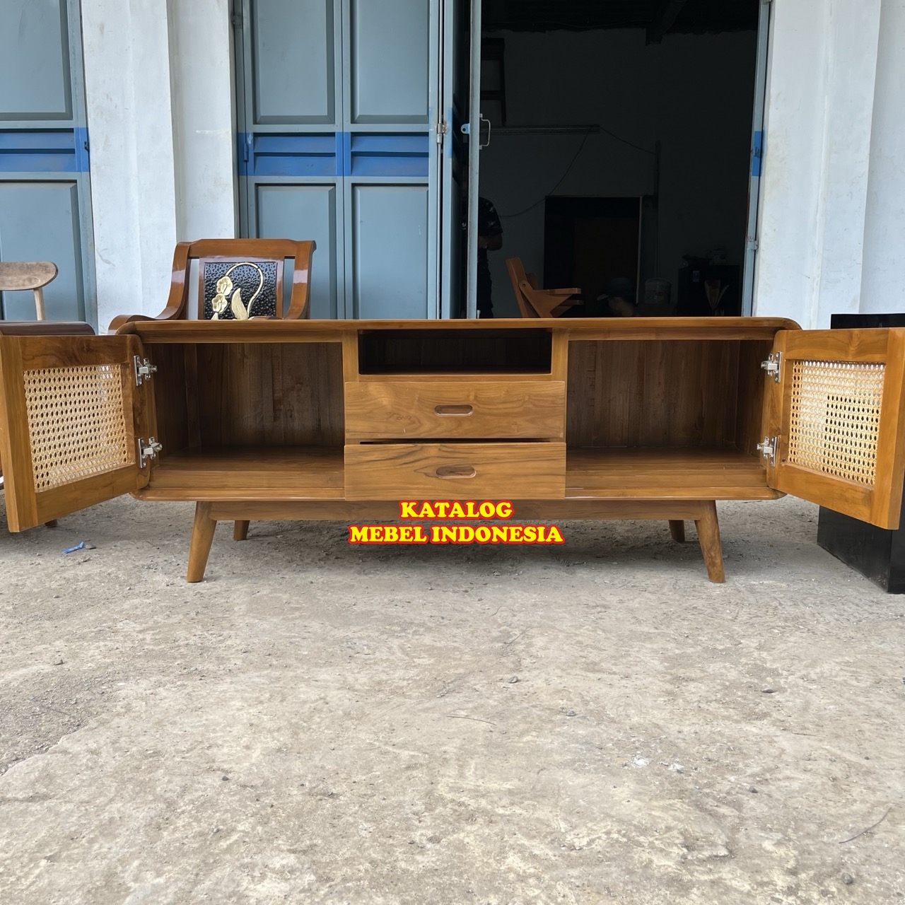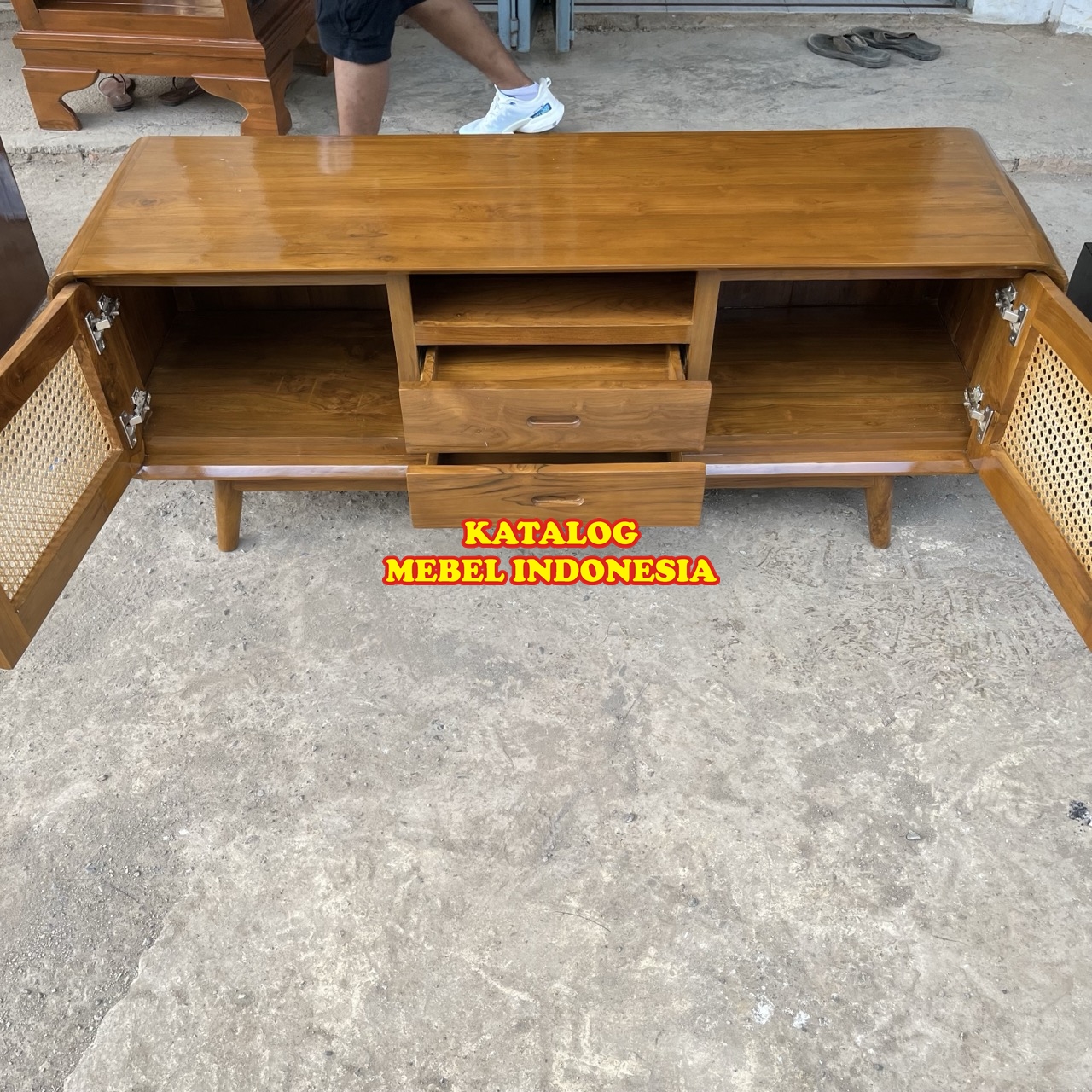 Bufet Meja TV Jati Minimalis Retro Pintu Rotan