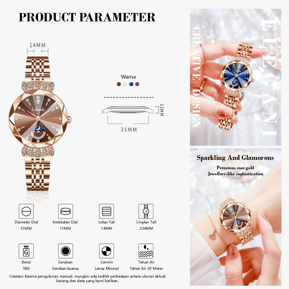 [Mall] Jam Tangan Wanita Fashion Labaoli Rantai Batu Permata Kaca Berlian & Anti Air Original Free Box Original