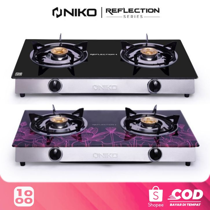 Kompor Gas 2 Tungku Kaca Niko Reflection 2 Tempered Glass 7mm Burner Kunan Plus Selang Regulator
