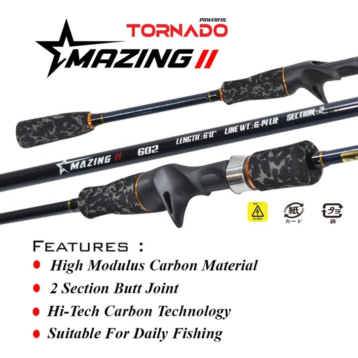 TORNADO Joran Baitcasting Murah AMAZING II Sambung 2 Mid Joint Carbon Hollow 168CM - 198CM Untuk Fresh Water Game