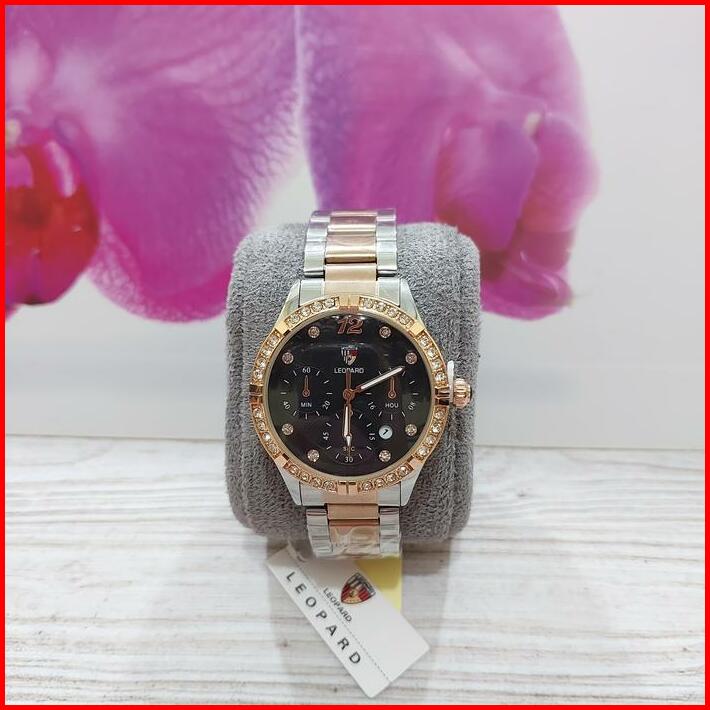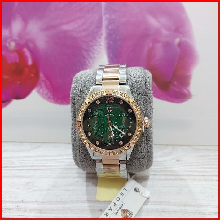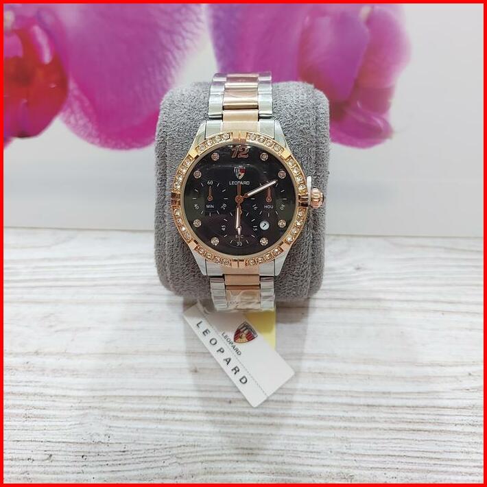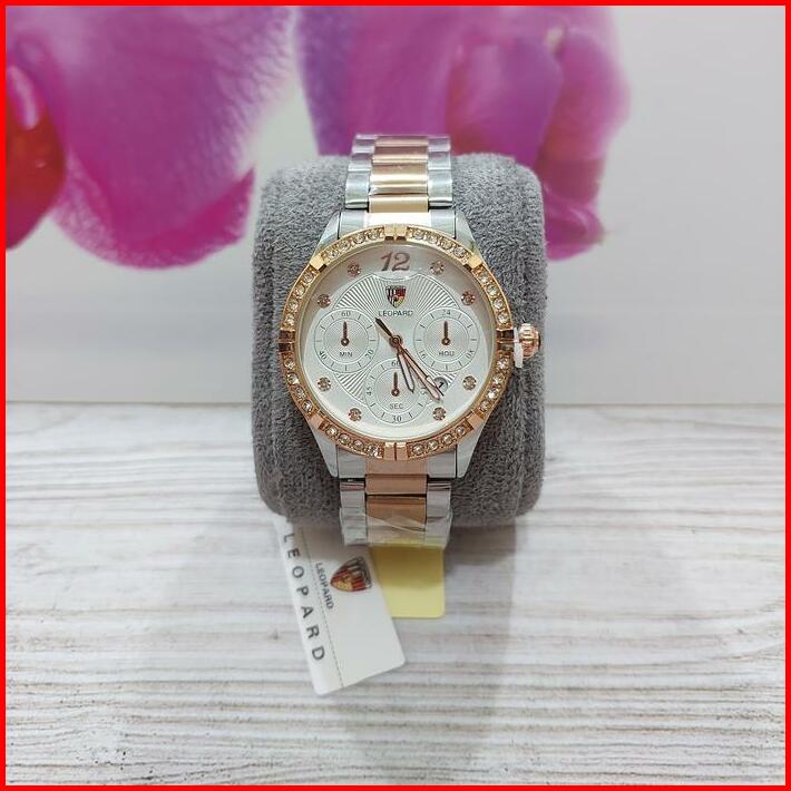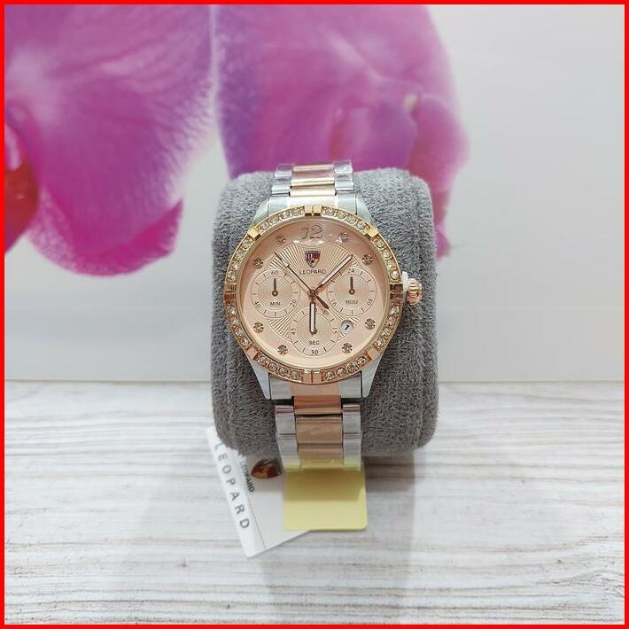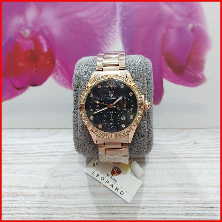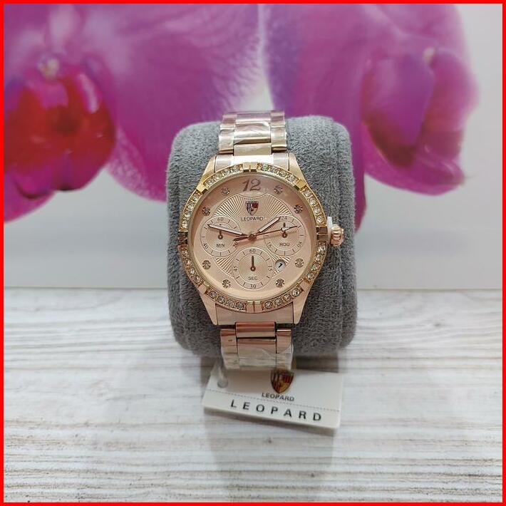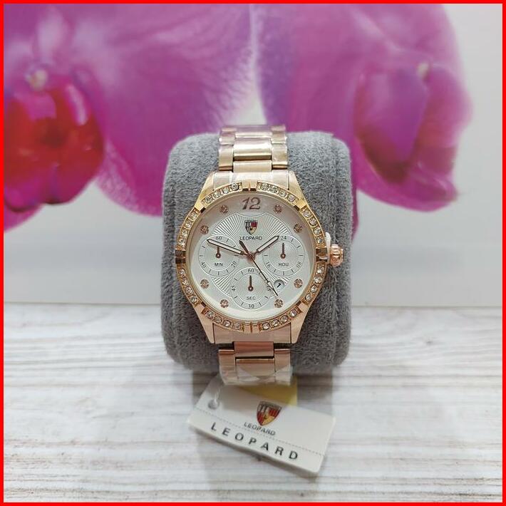 Lengkap Box Jam Tangan Wanita Merk Leopard 8077 Tampilan Analog Tanggal Aktif Rantai Stainlees Watches