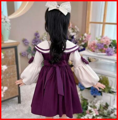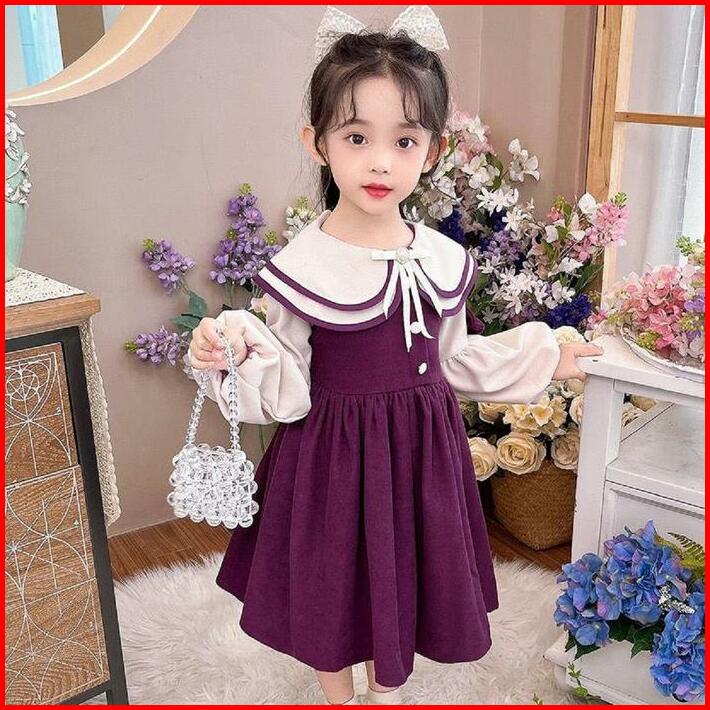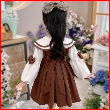 Angenius Dress Gaun Rok Lengan Panjang Anak Perempuan Corduroy Renda-neck Pita Polos Korean Style Fashion