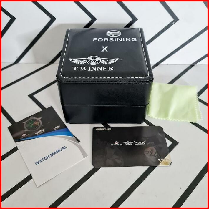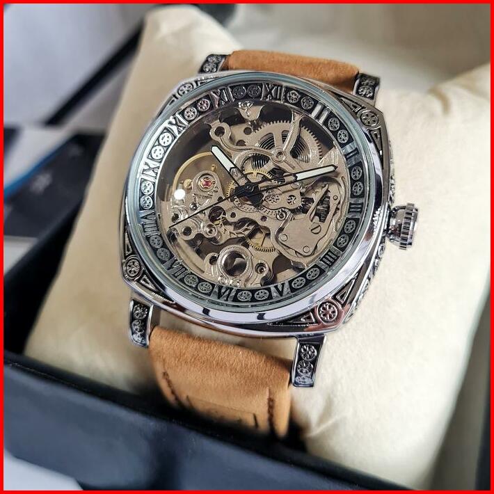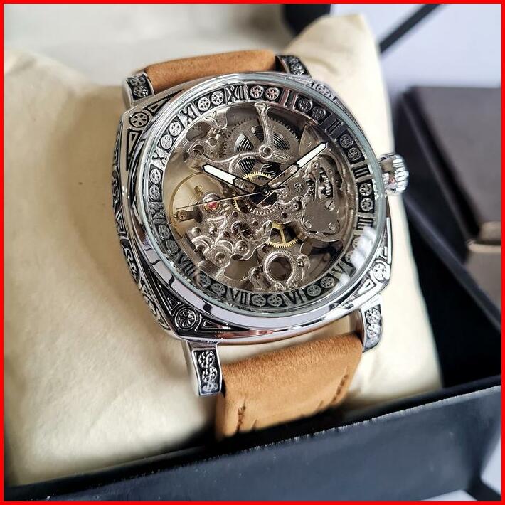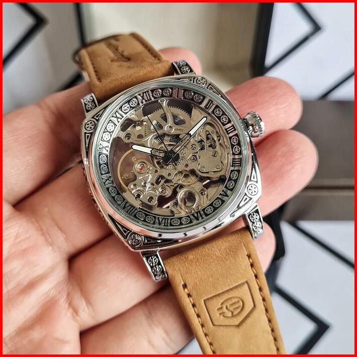 Jam Tangan Pria Original Forsining Tyrant Automic Otomatis Mechanical Mekanik Skeleton Kotak Square Silver Tali Coklat B