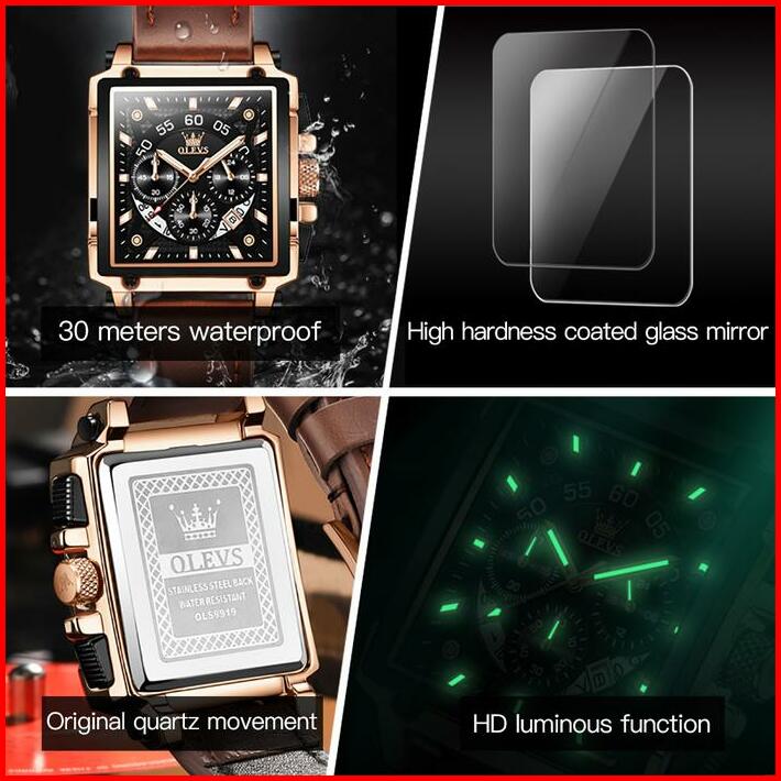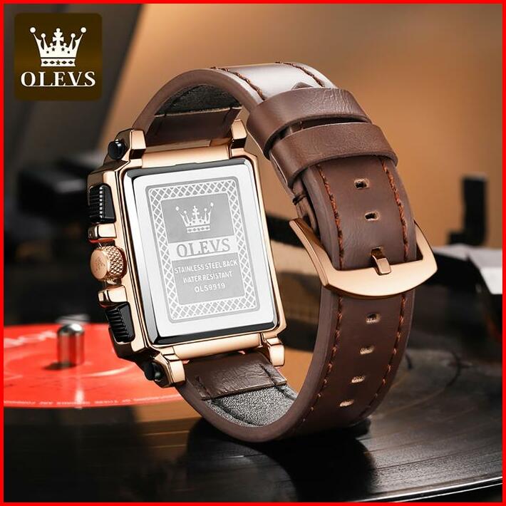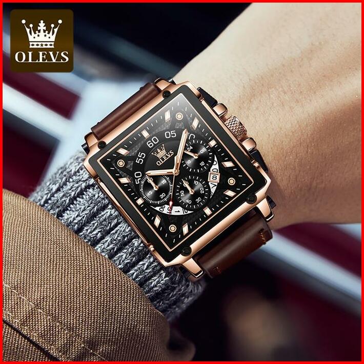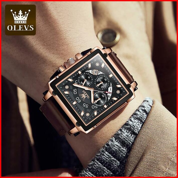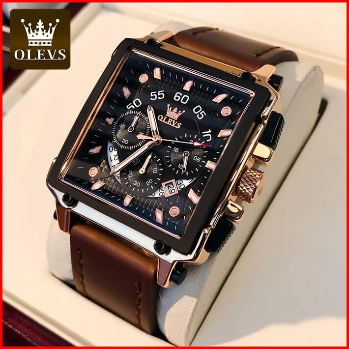 Olevs Jam Tangan Pria Kulit Anti Air Original Asli Terbaru Casual Tahan Air Square Chronograph Leather Dengan Kotak Tang