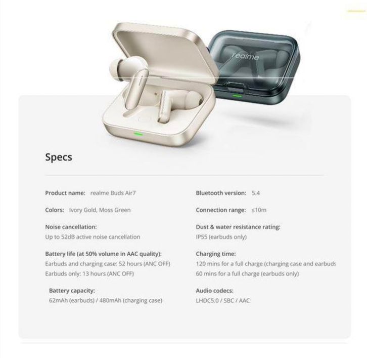Realme Buds Air7 / Air 7 with 52dB ANC 12.4mm Driver 52hrs Playback IP55 & 45ms Low Latency Bluetooth