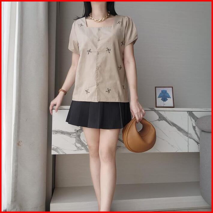 Miki Grace Ribbon Basic Button Cotton Blouse Atasan Blouse Wanita Pita Lengan Pendek Kancing Motif Polos Korean Style Ke