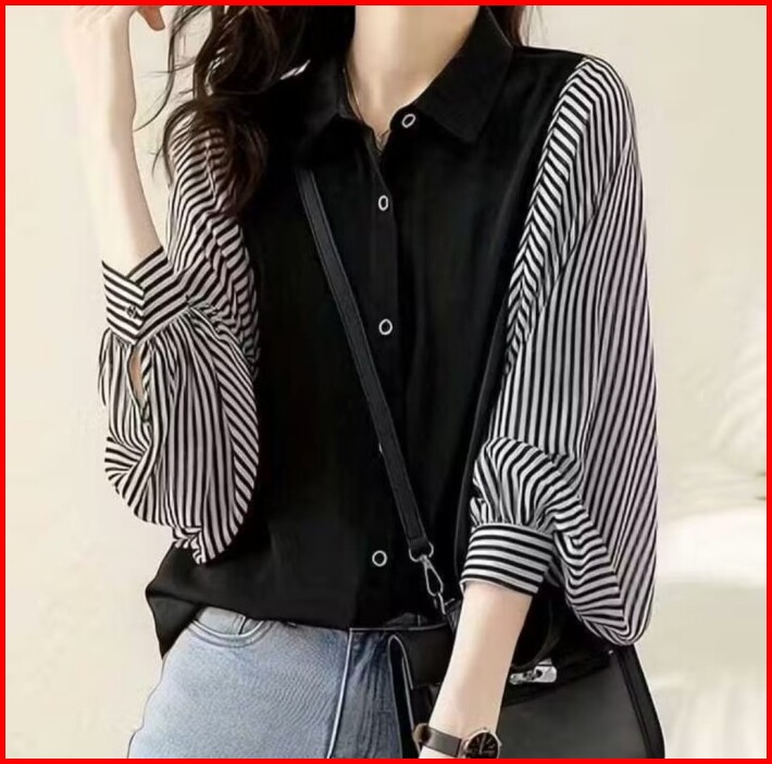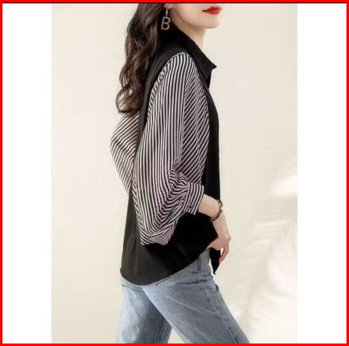 Kemeja Wanita Atasan Wanita Lengan Panjang Motif Polos Kombinasi Salur