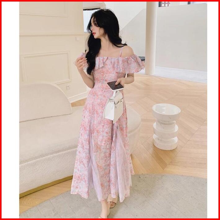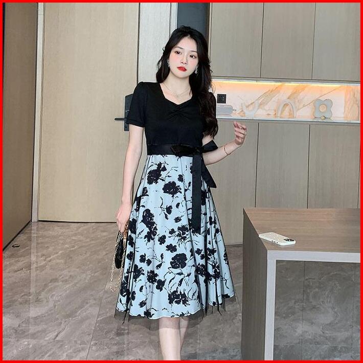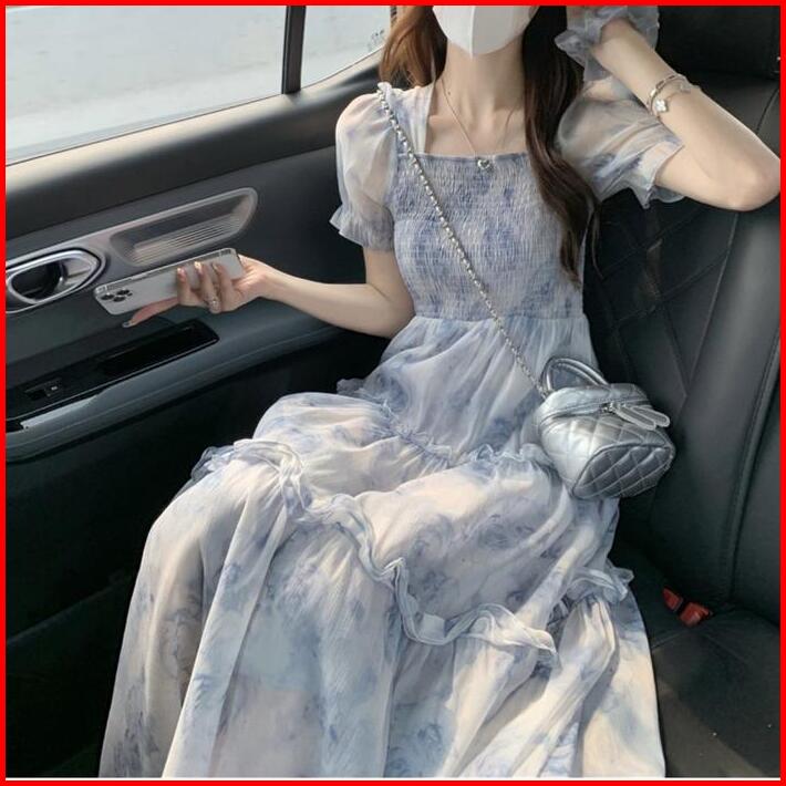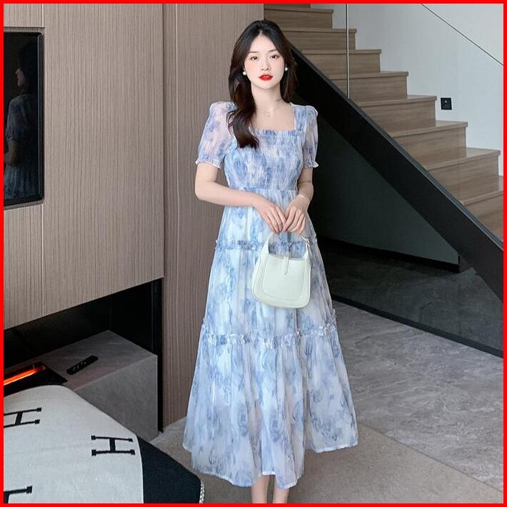 1211 Blue Midi Dress Baju Pantai Wanita Floral Dress Biru Korean Style Party Elegan Xs-2xl Long Dress