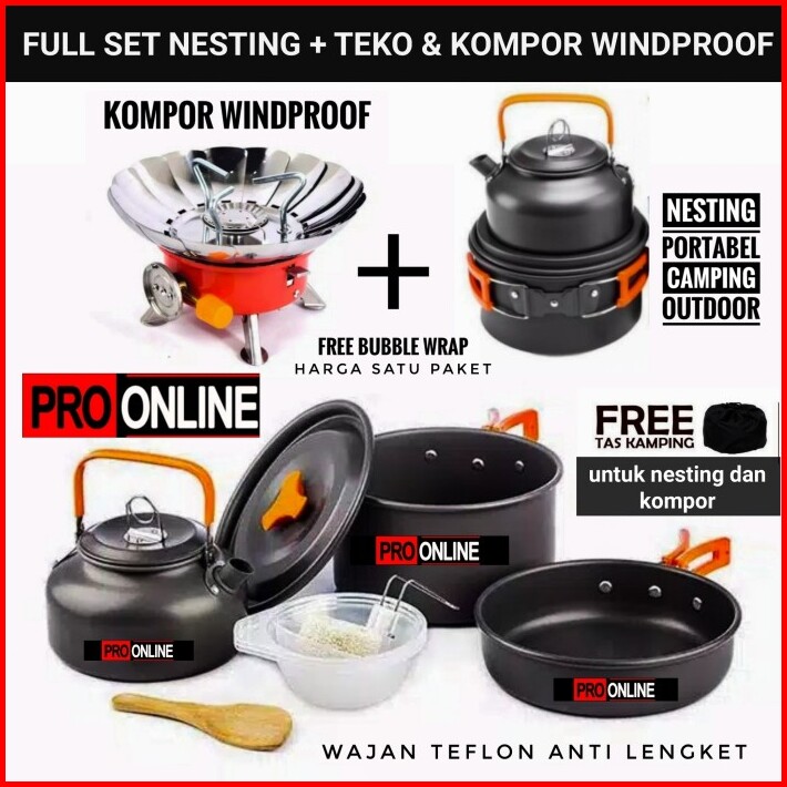 Nesting Teko Kompor Windproof Kemping Gunung Cooking Set Camping