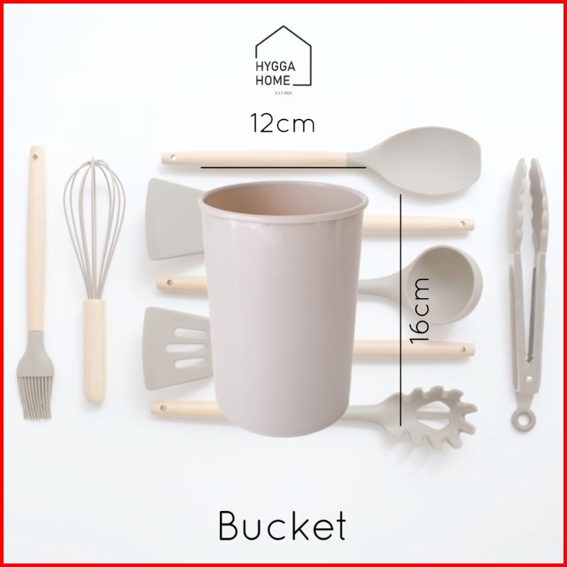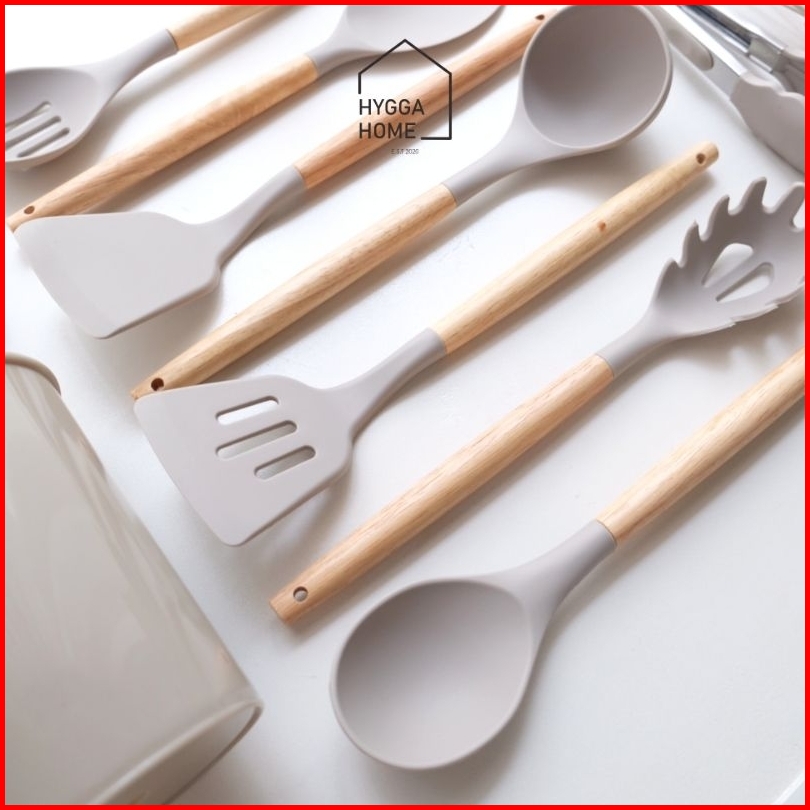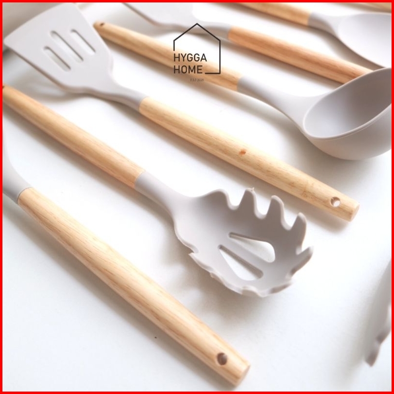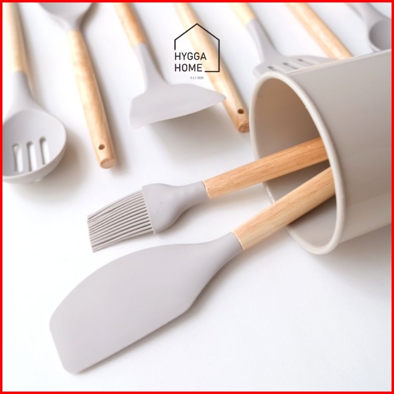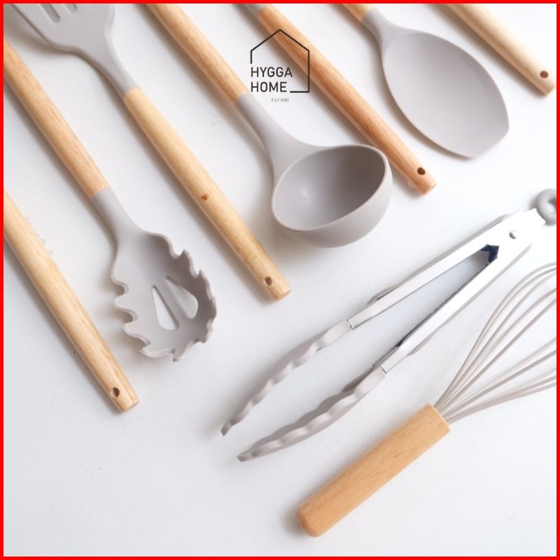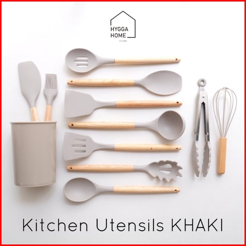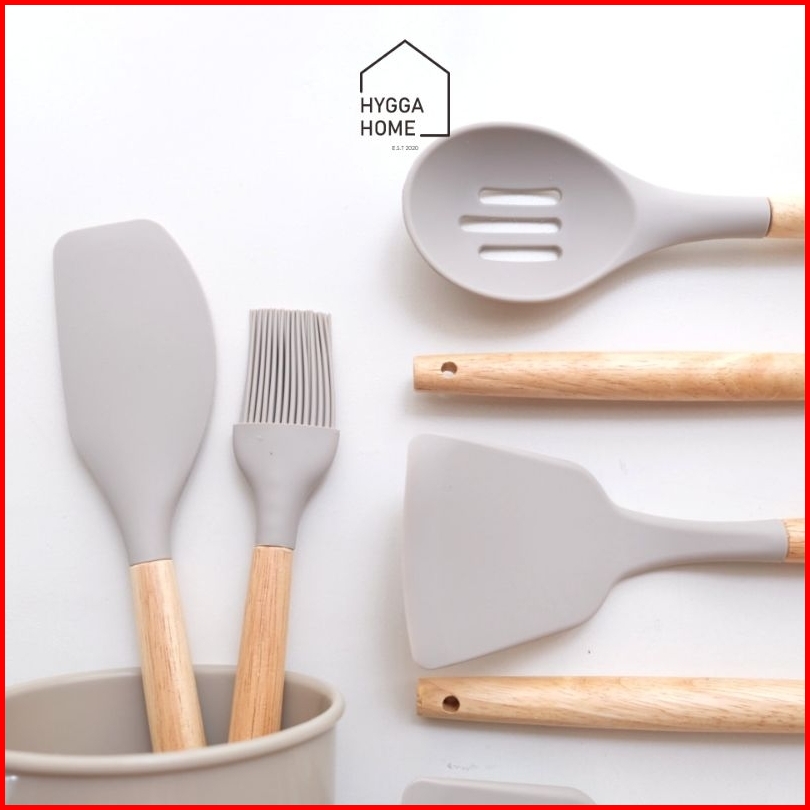 Hygga Home Khaki Silikon Sutil Pencapit Spatula Kuas Sendok Gagang Kayu Silicone Kitchen Utensils