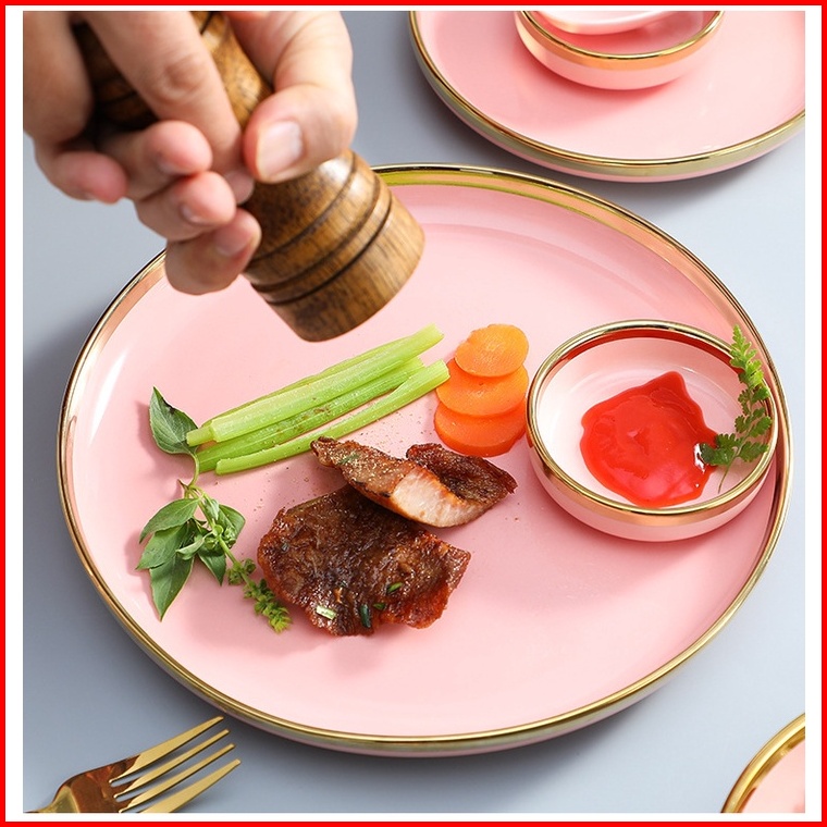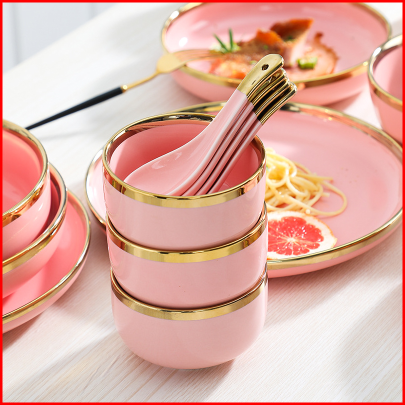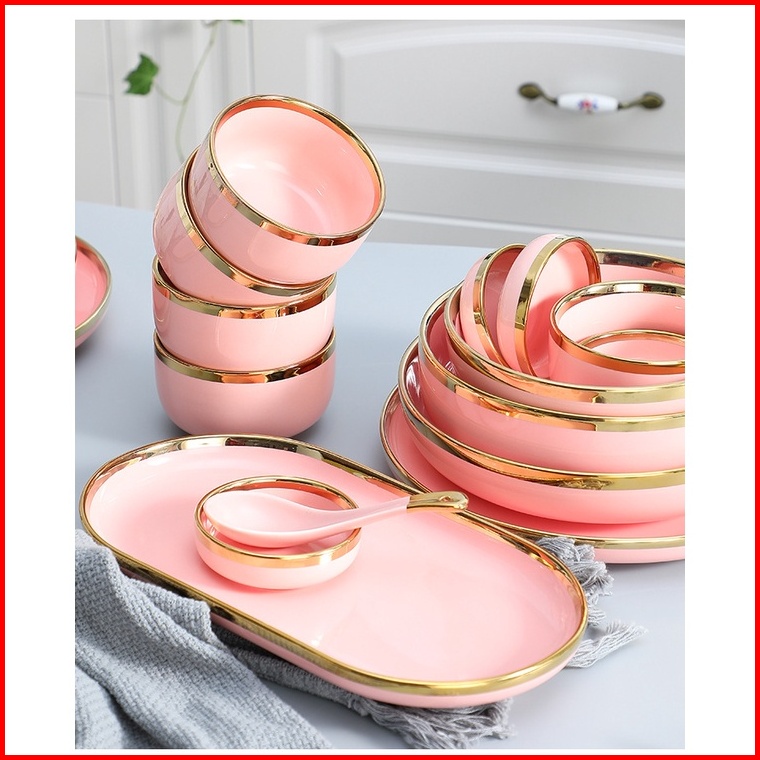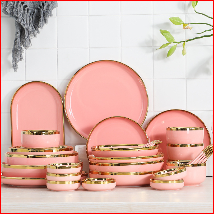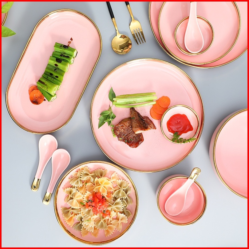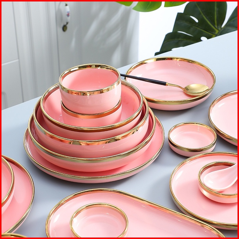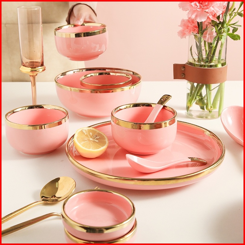 Ashome Piring Makan Keramik Pink Piring Pink Keramik List Mangkuk Keramik Pink Elegan Piring Keramik Mewah Piring Kerami