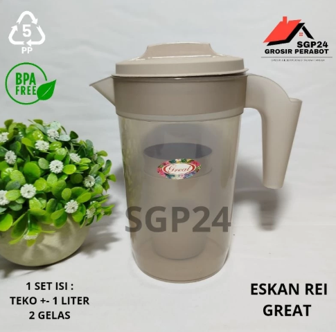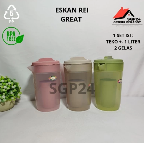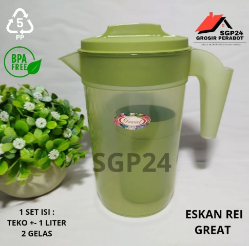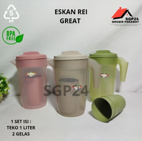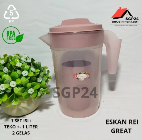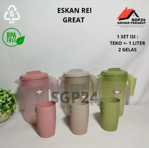 Great - 3 In 1 Eskan Plastik Rei Teko 1 Liter + 2 Gelas Teko Eskan Pitcher Ceret Set BPA Free