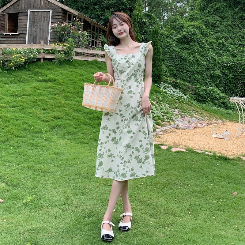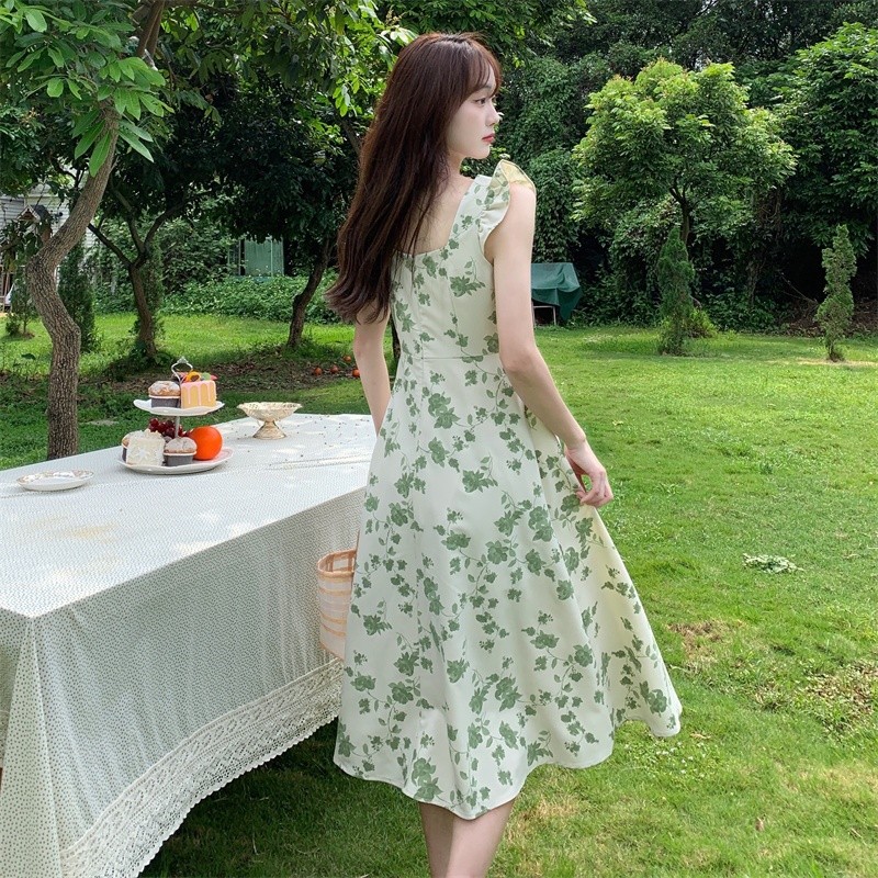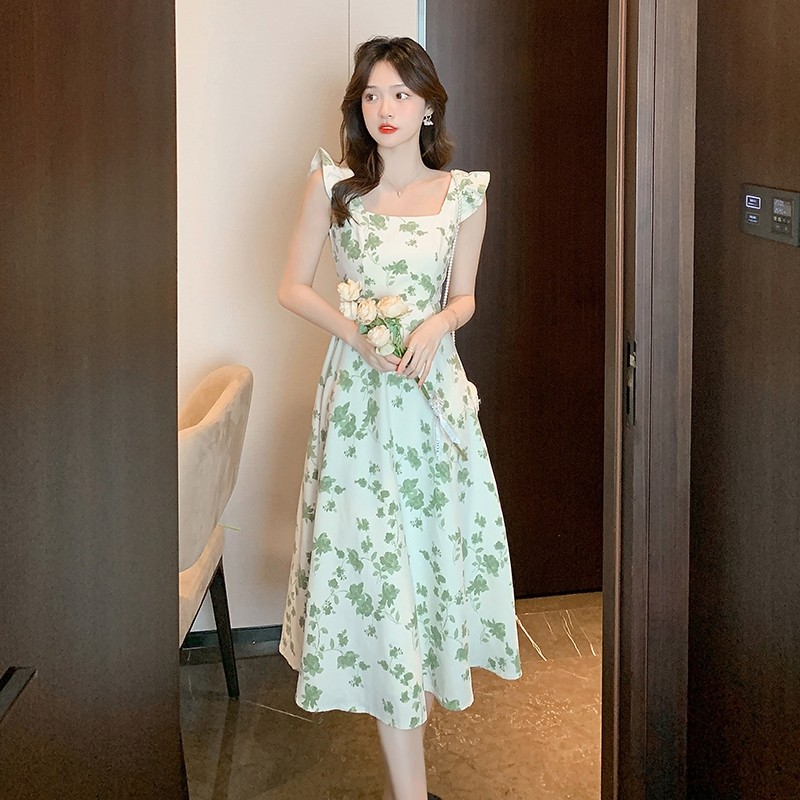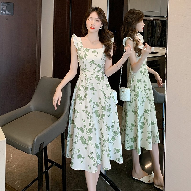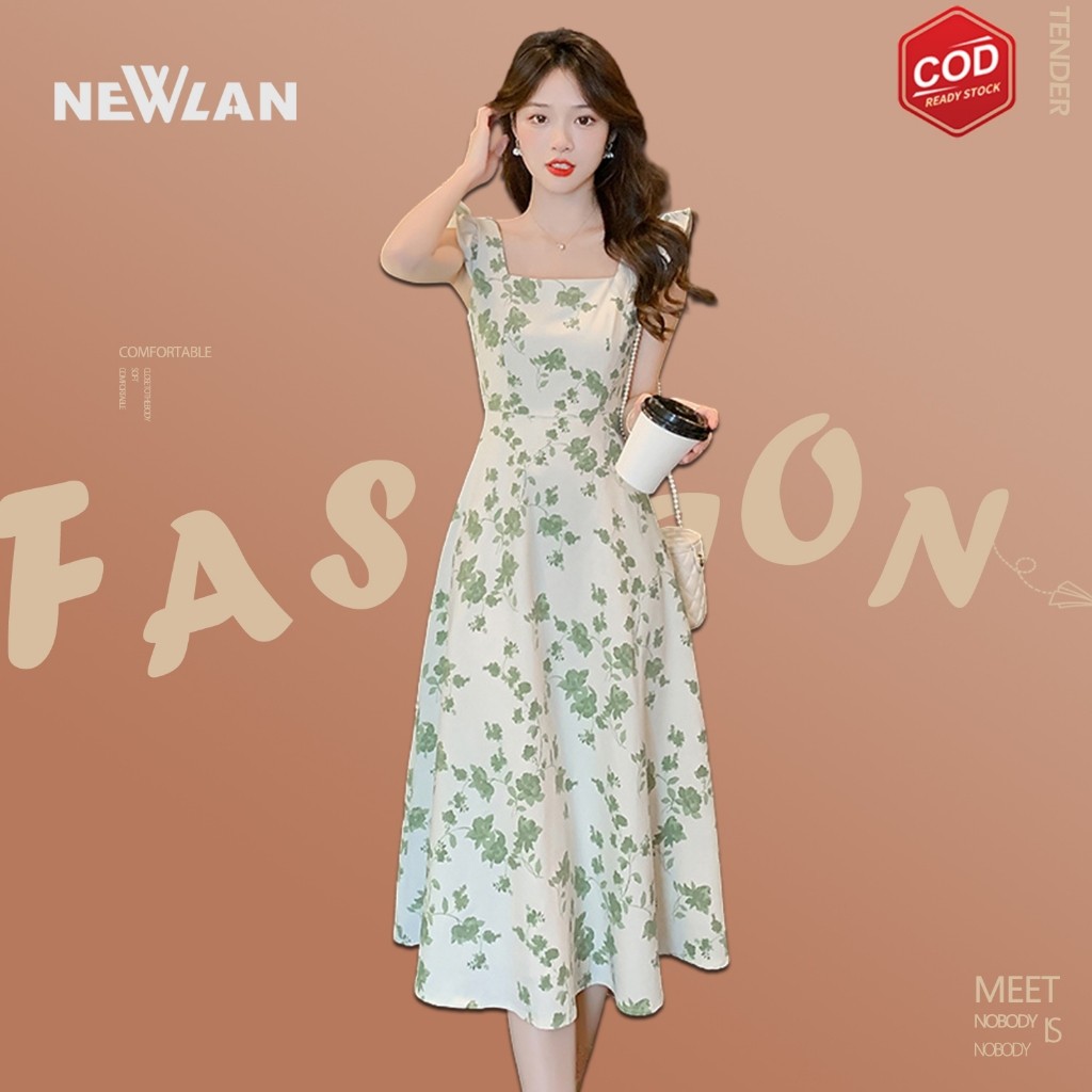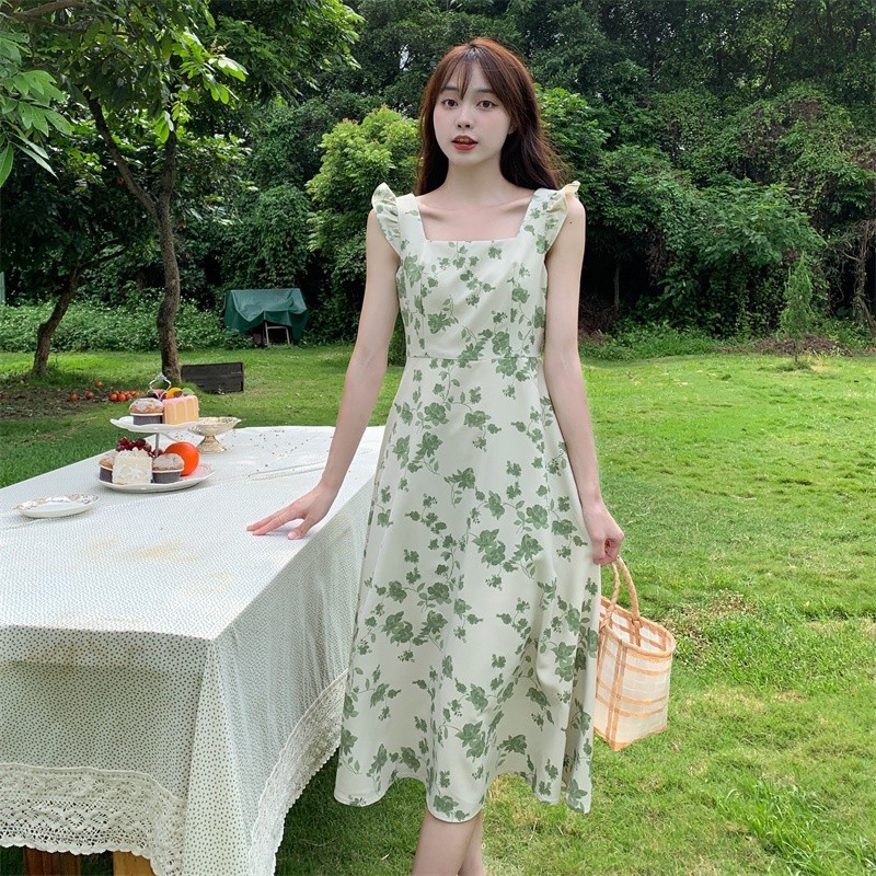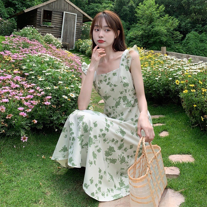 Newlan QZ169 Sexy Green Beach Dress For Woman Korean Fairy Halter Sleeveless Floral Long Dress Hijau Wanita Bunga Pantai