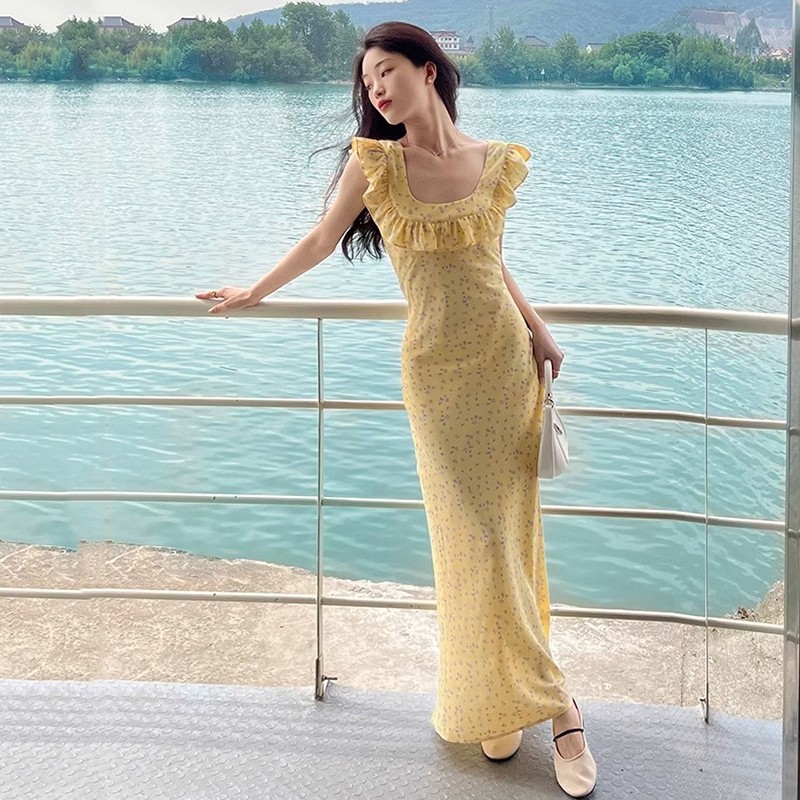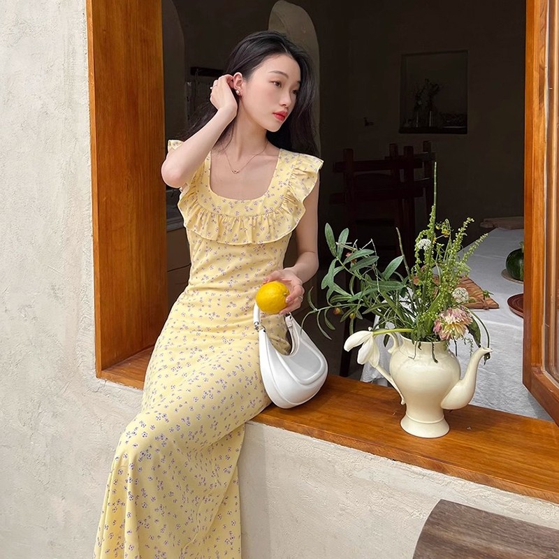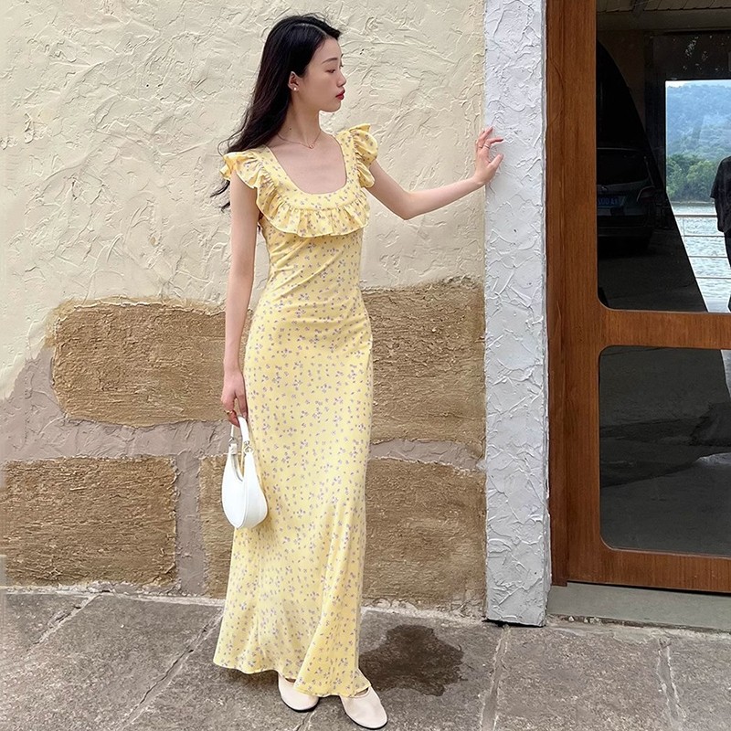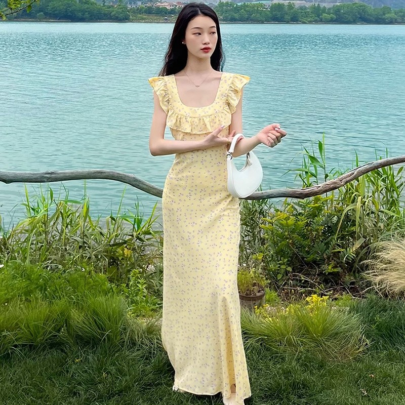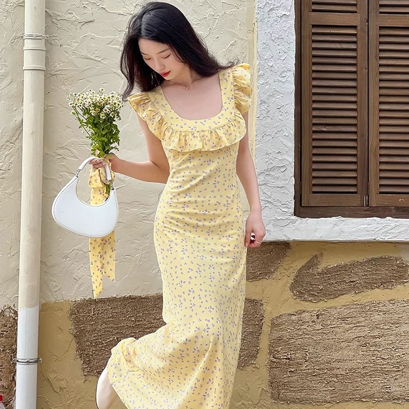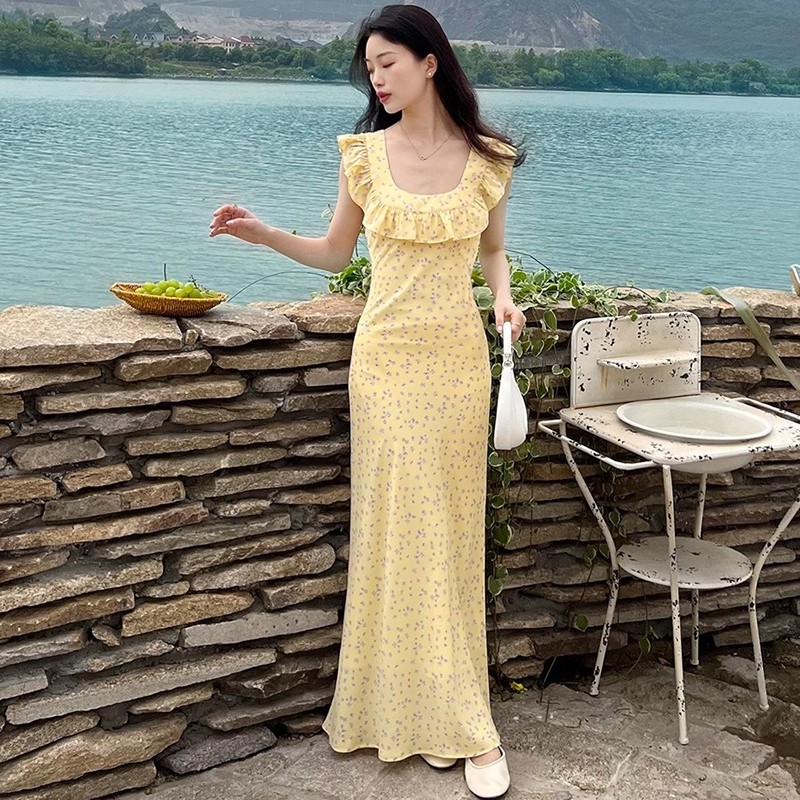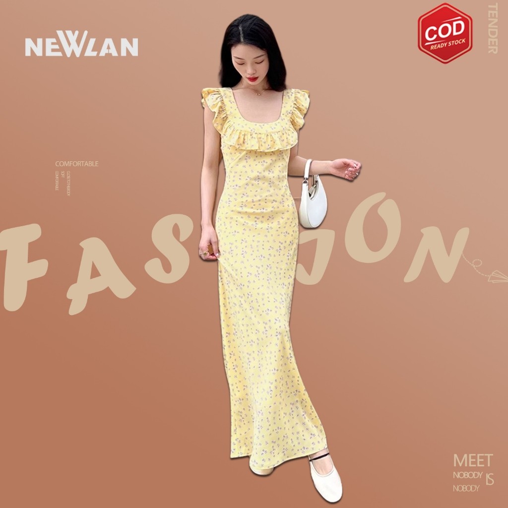 Newlan QZ175 Summer Dress Wanita Gaun Bunga Retro Perancis Rok Panjang A-line Pelangsing Pinggang Desain Lengan Baru Kor