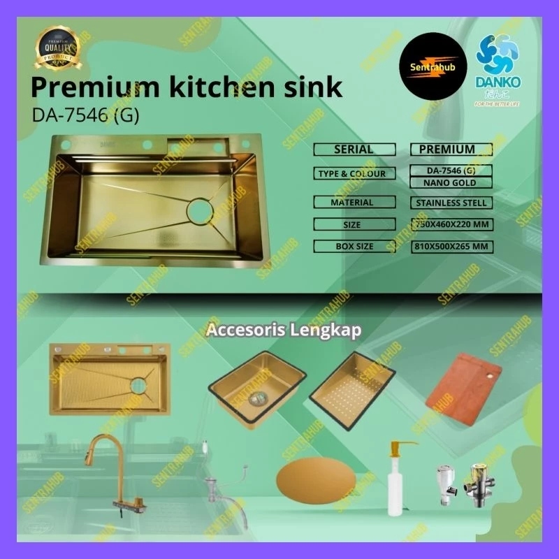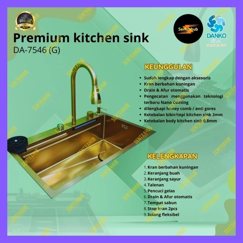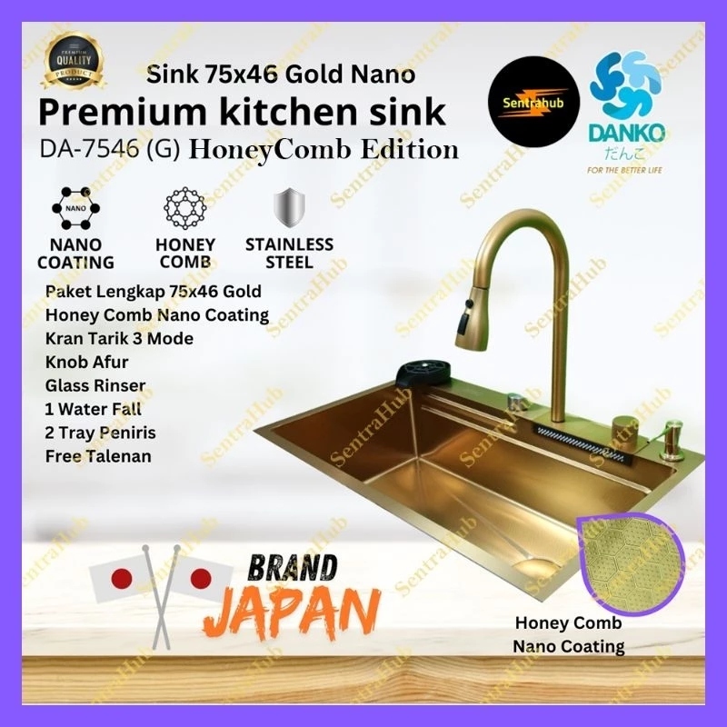 KITCHEN SINK WATERFALL STAINLESS GOLD 7546 HONEY COMB NANO COATING PREMIUM EDITION SET BAK CUCI PIRING AIR MANCUR BEST S