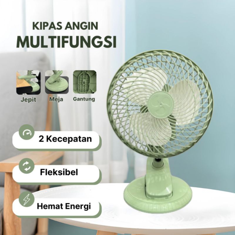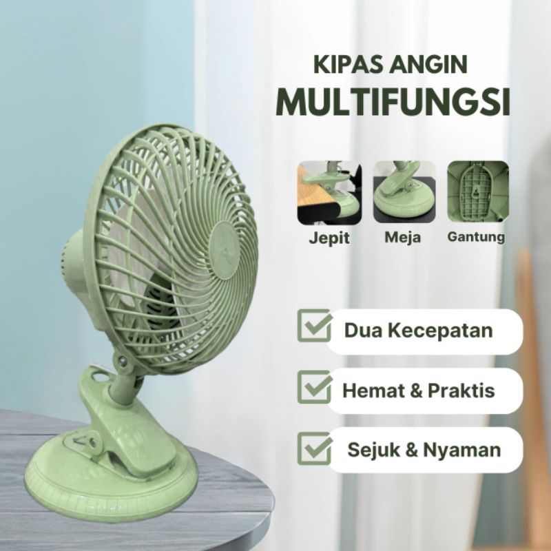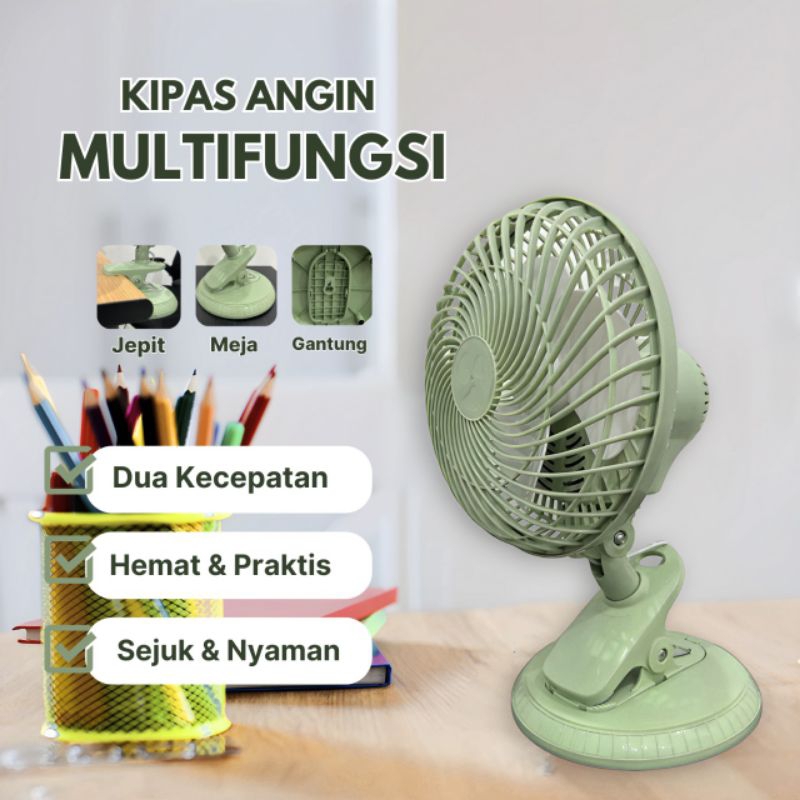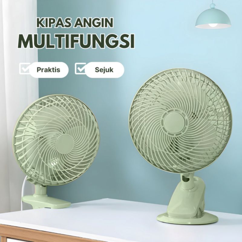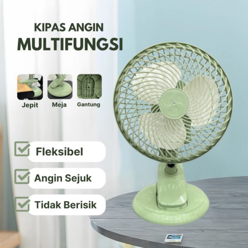 Kipas Angin Multi Fungsi Jepit+Meja Duduk+Dinding Tembok Muter Kiri Kanan Ukuran 8 Inch
