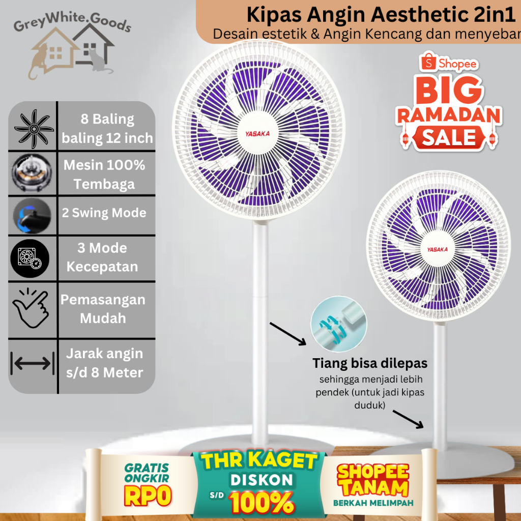 Kipas Angin Berdiri Duduk 2in1 8 Estetik 8 Baling baling 12 Inch Aesthetic Angin Kencang Halus