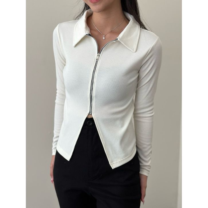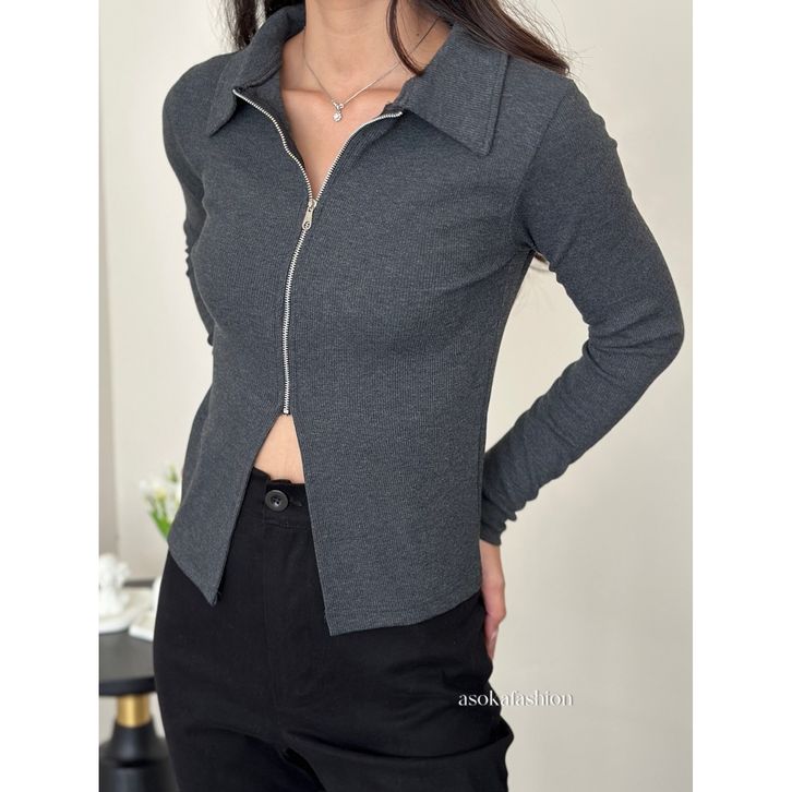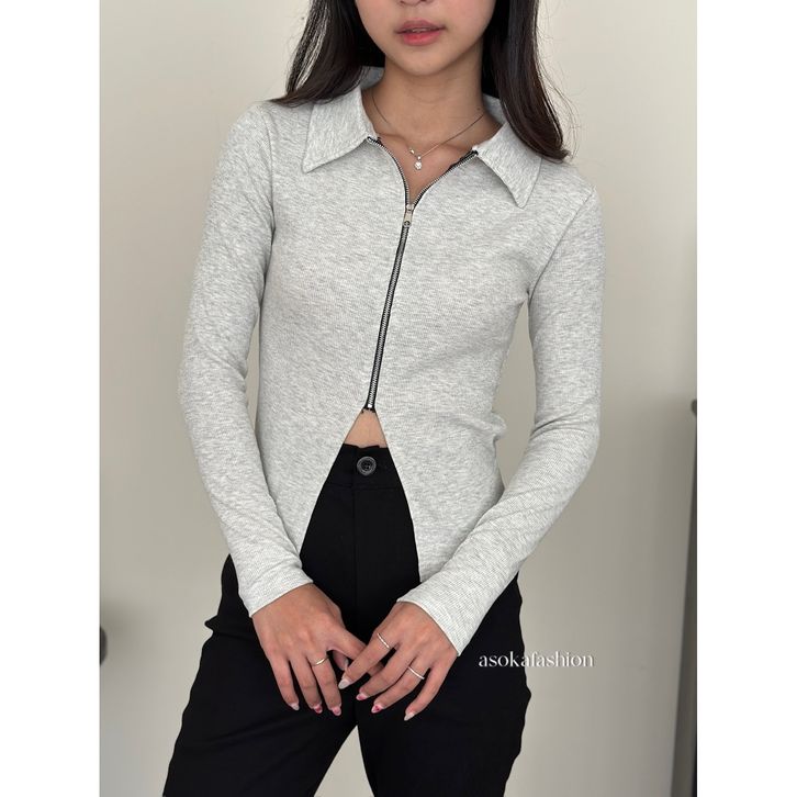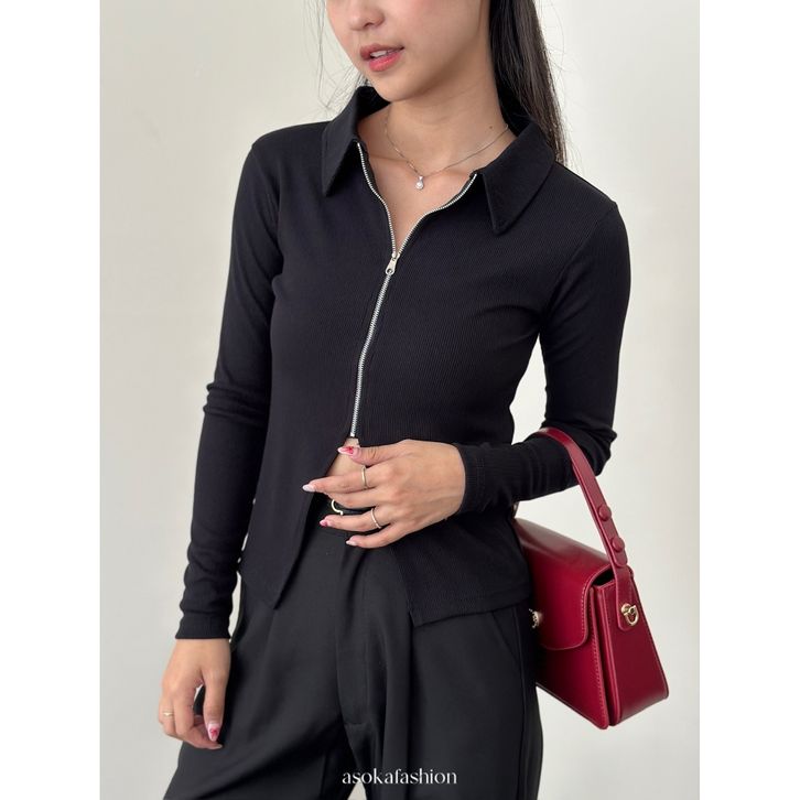 ASOKA Villi Top 830 - Korean Polo Knit Zipper Long Sleeve Slim Fit - Atasan Wanita Casual