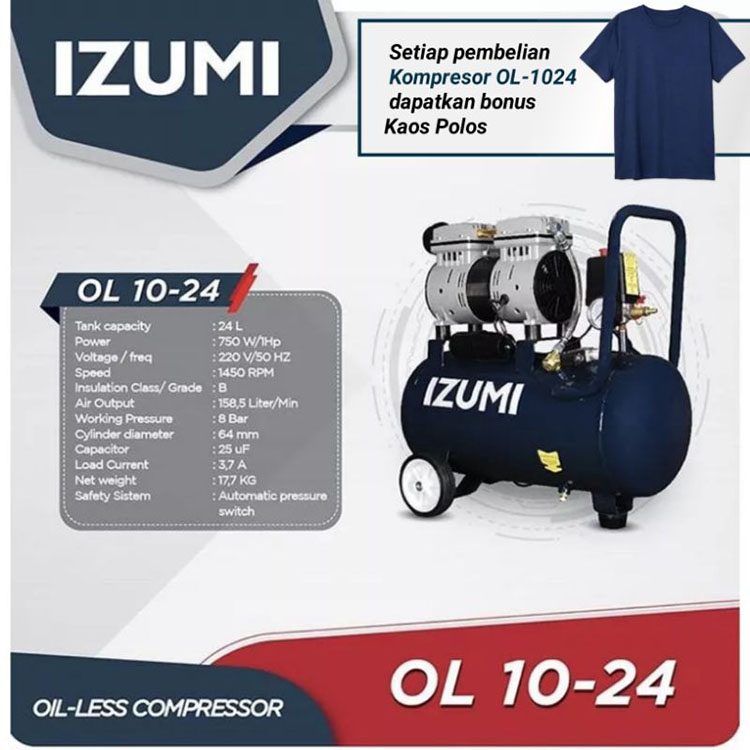 Kompresor Angin Listrik 1HP 24liter IZUMI OL1024 Oilless Silent Kompressor Tanpa Oli Japan Teknologi Bonus Kaos
