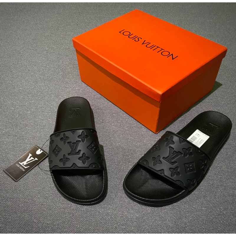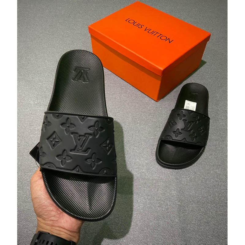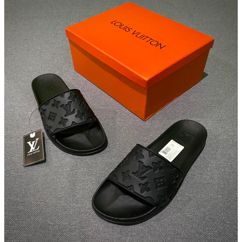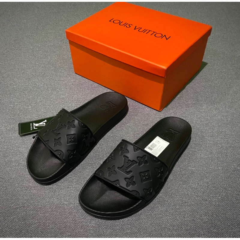 sandal slip-on premium || MIROR || motif embose full Black +free boxs
