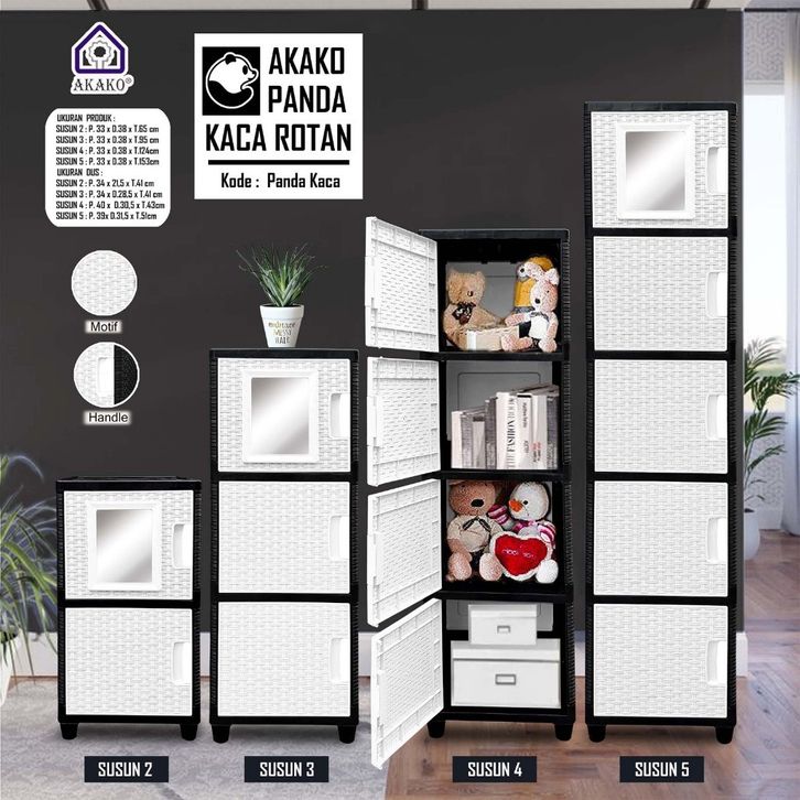 AKAKO Lemari Pakaian Plastik PANDA KACA CERMIN Rotan putih Susun 2 3 4 5 Pintu Laci BAGUS KOKOH