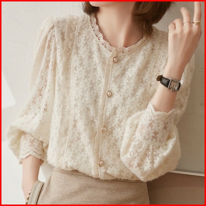 Atasan Blouse Lace Soft Creme Beige Korean Style Elegant Top Osy