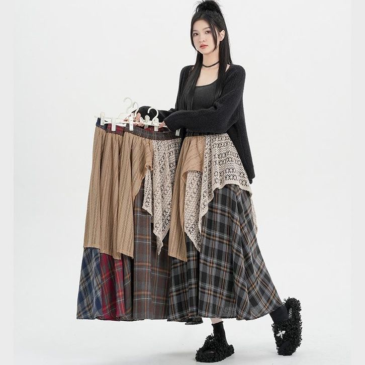HEYSOUL Rok Panjang Bohemian Wanita Motif Kotak – M0Del Asimetris Kombinasi Renda Tartan Vintage