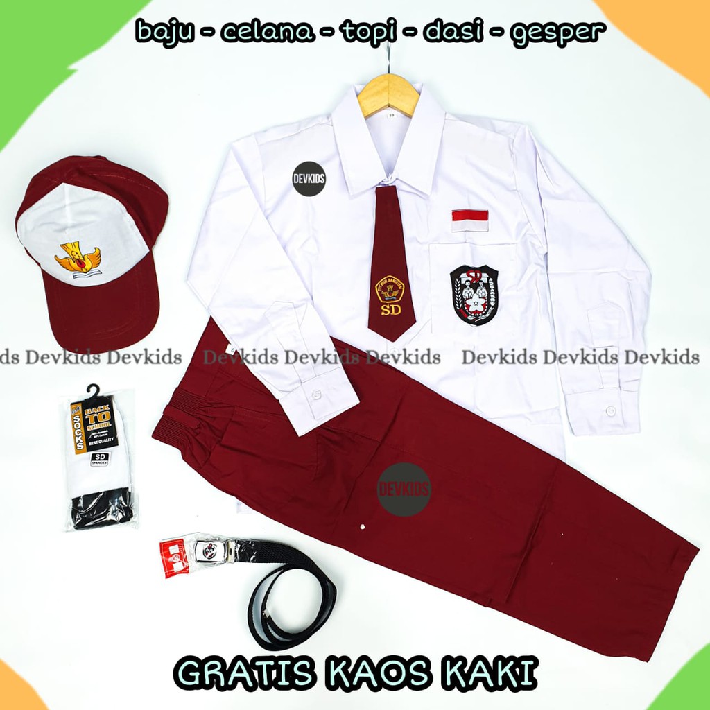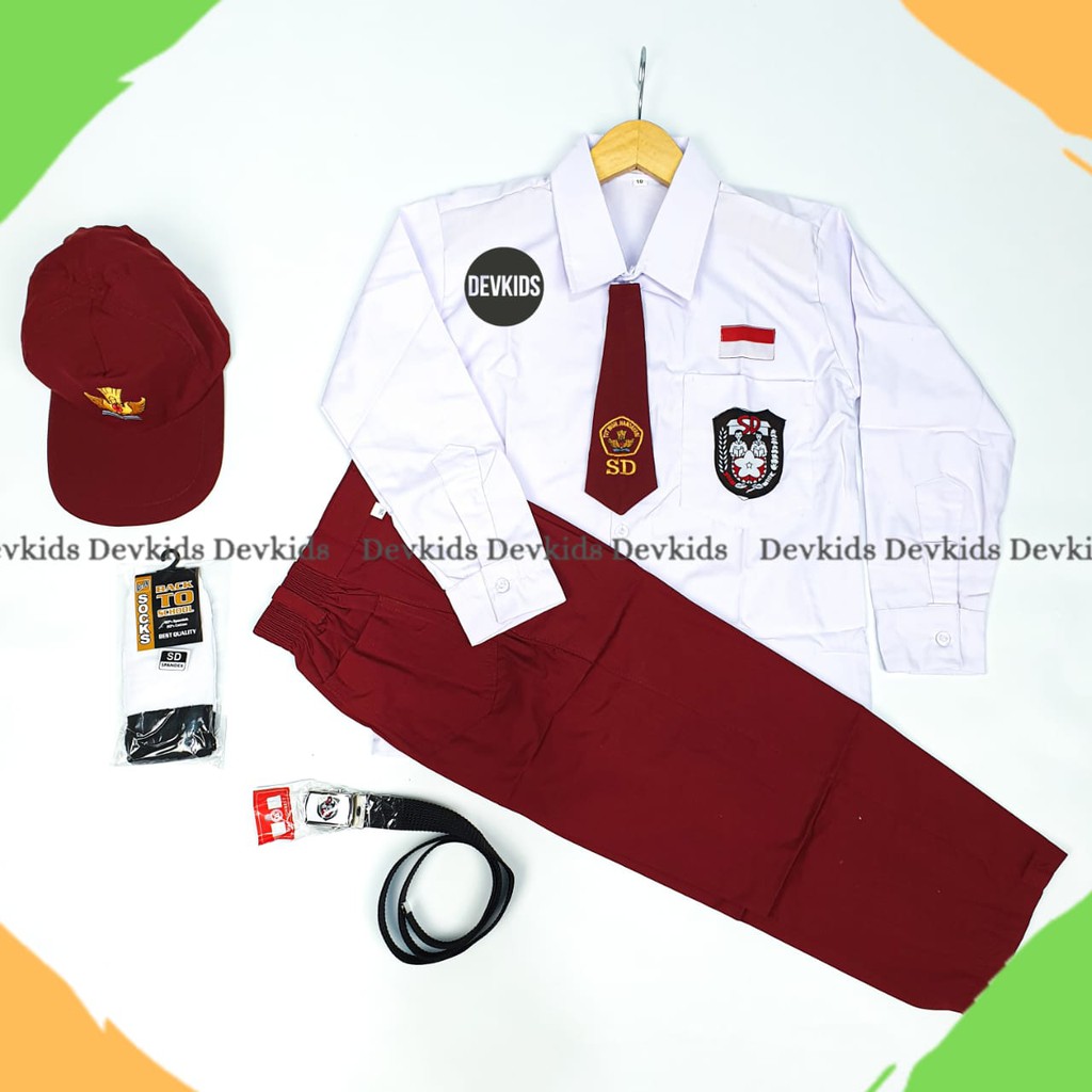 Devkids Setelan Super Lengkap Seragam Sekolah SD Merah Putih Lengan Panjang Laki-laki Kelas 1-6 SD