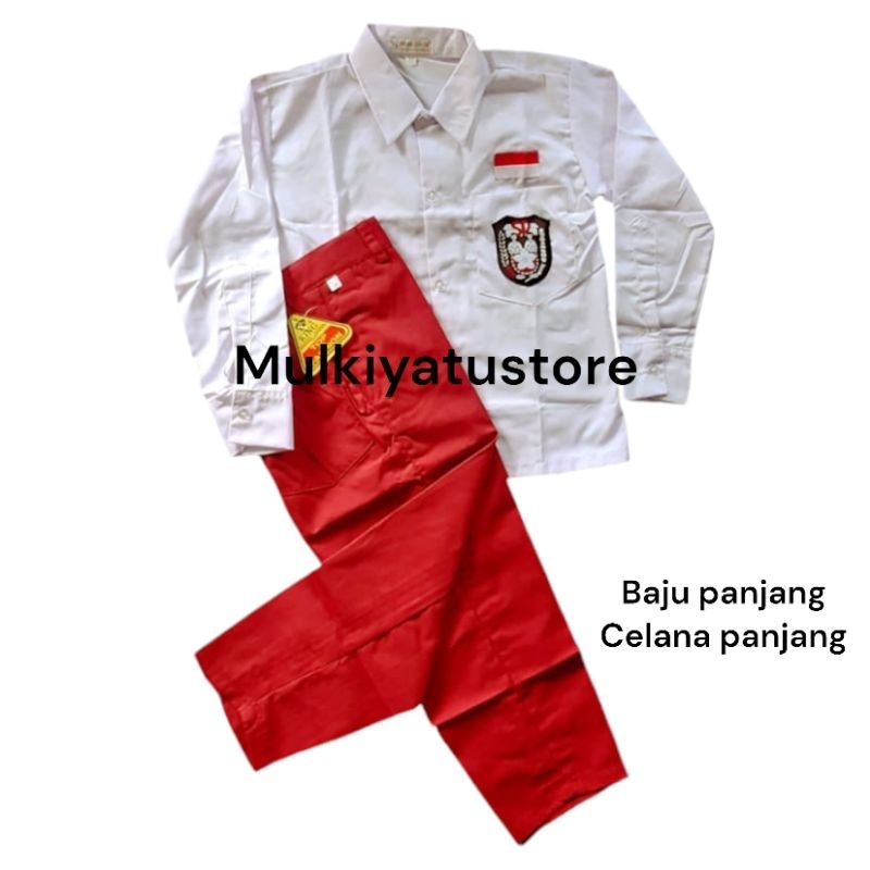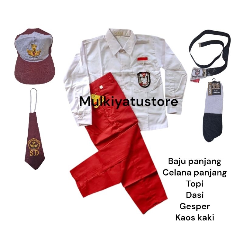 SERAGAM SD SETELAN SET MERAH PUTIH LENGKAP LAKI LAKI BAJU PANJANG DAN CELANA PANJANG TOPI,DASI,GESPER,DAN KAOS KAKI