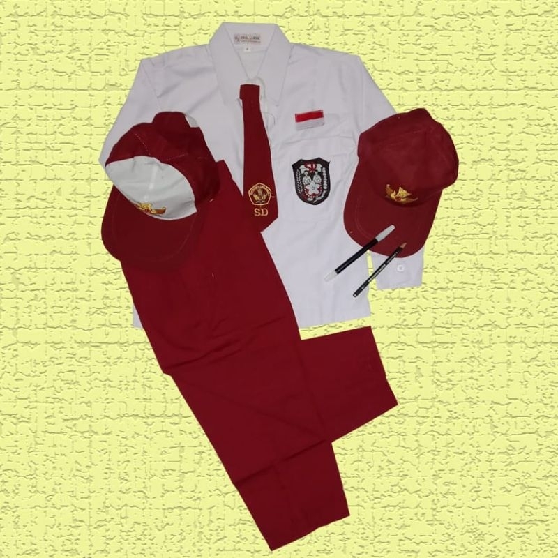 SERAGAM SD SETELAN LAKI-LAKI KEMEJA PANJANG DAN CELANA PANJANG TOPI DAN DASI