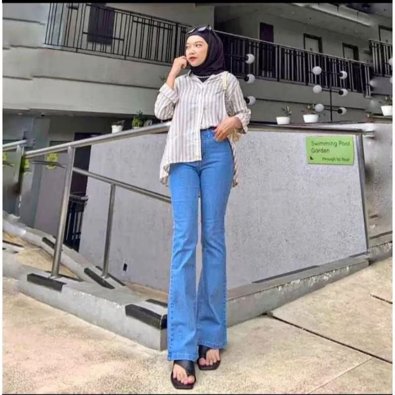 (Gratis Ongkir) Highwaist Cutbray Jeans Wanita Celana Stretch Kekinian Flared Premium Quality Panjang Denim Import