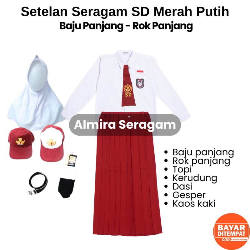 Setelan Super Lengkap HIJAB Seragam Sekolah SD KEMEJA BAJU PANJANG ROK PANJANG KERUDUNG Perempuan Cewek