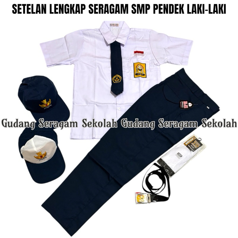 Setelan Lengkap Seragam SMP Baju Putih Pendek dan Celana Biru Panjang untuk anak laki-laki