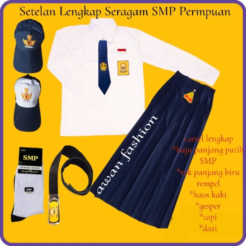 Setelan Seragam Sekolah SMP Perempuan Biru Putih Baju Panjang Rok Panjang Lengkap