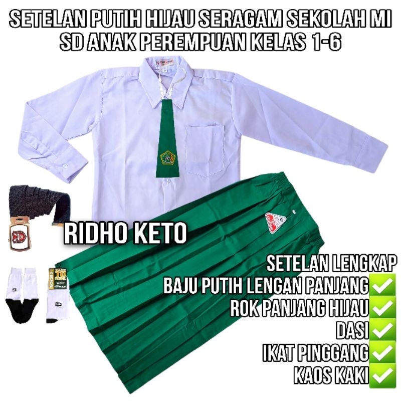 Setelan Seragam Sekolah putih hijau MI SD anak Perempuan baju lengan panjang rok hijau Panjang kelas 1-6