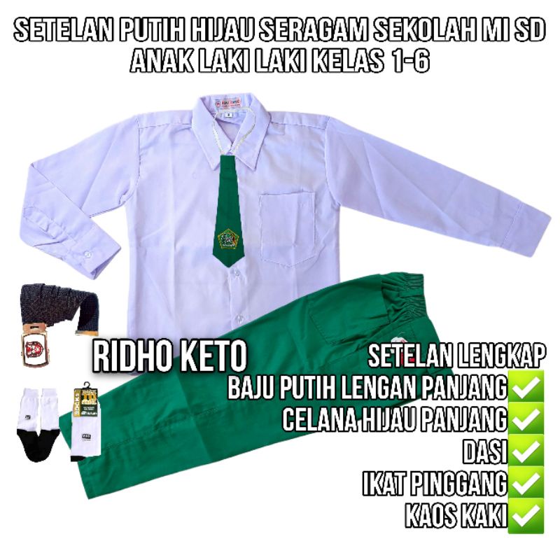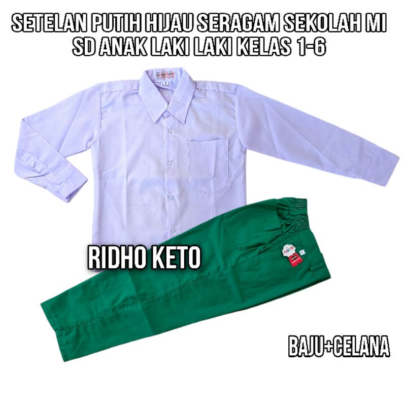 Setelan Seragam Sekolah MI Putih Hijau anak Laki Laki Baju putih polos lengan panjang celana hijau Panjang Kelas 1-6