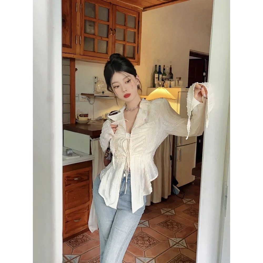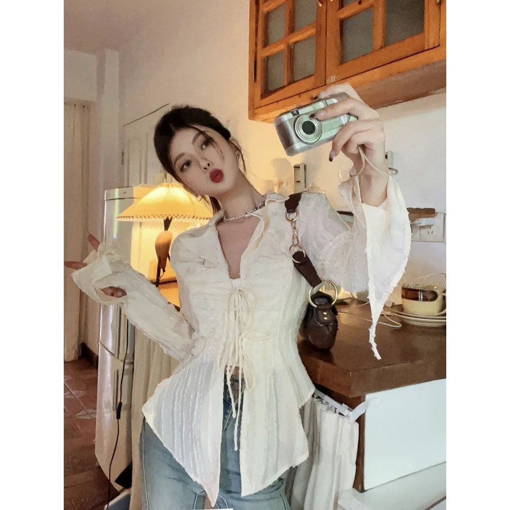 Kemeja Wanita Kekinian Korea Gaya Elegant Lengan Terompet Ramping Atasan Desain Estetik Best Seller