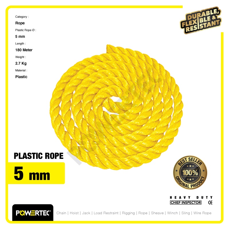 POWERTEC TALI TAMBANG PLASTIK 5MM X 180M PLASTIC ROPE - KUNING