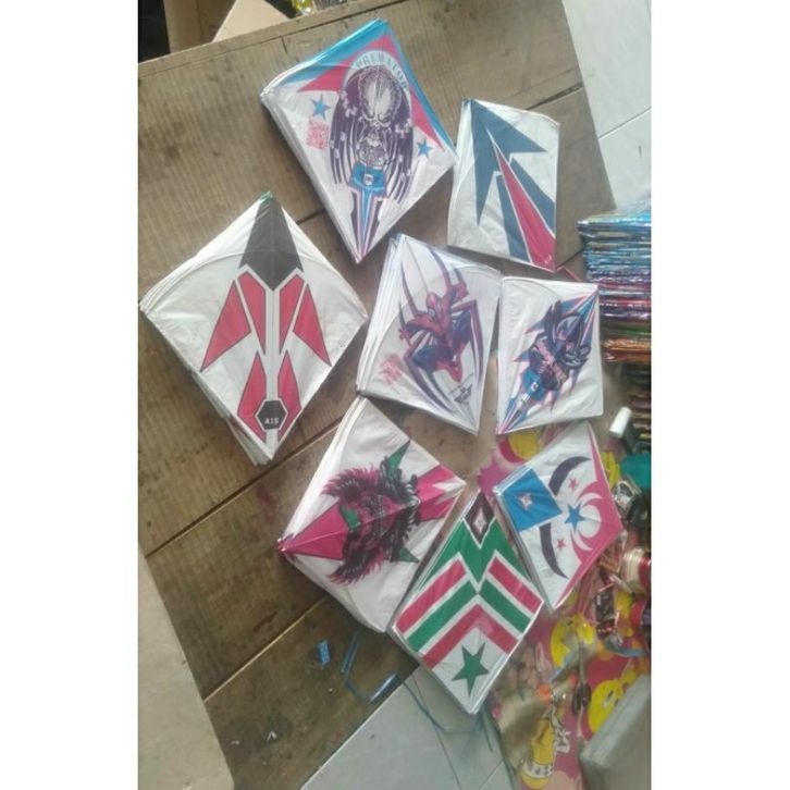 layangan plastik/kertas sablon/merah putih/kuning putih/ hijau putih , polos/pulas , ( isi 50 pcs layang layang sortiran