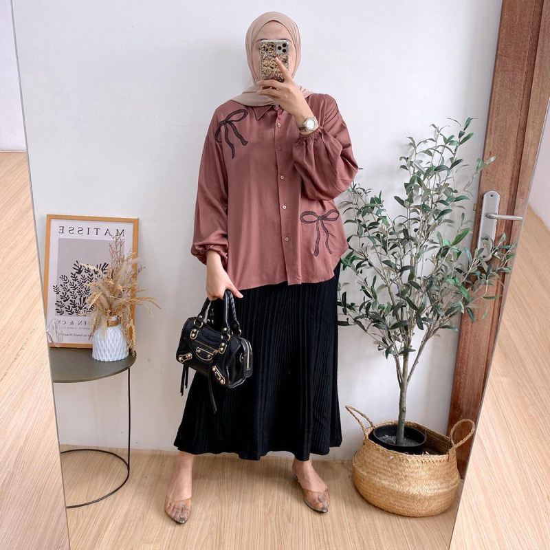 (Gratis Ongkir) Lena Blouse | Kemeja Wanita Bordir Ribbon Shirt Rayon Twill Premium