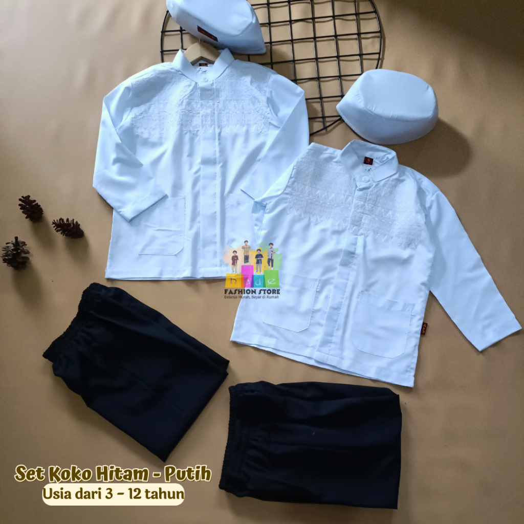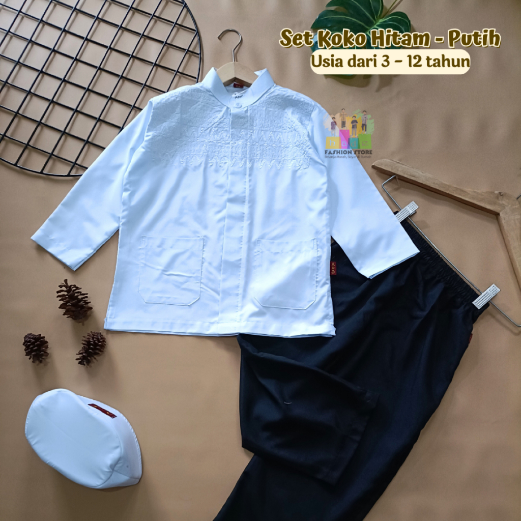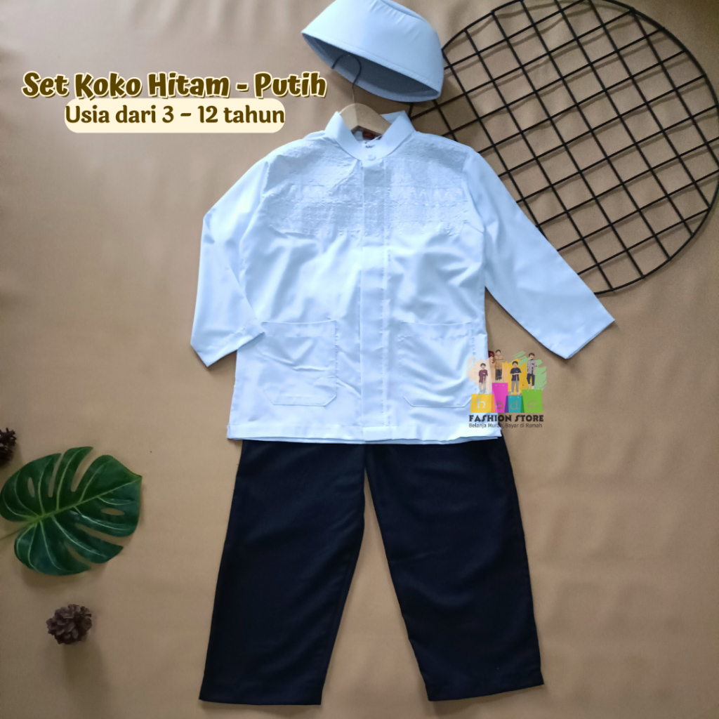 Setelan Koko Anak Hitam-Putih Full Kancing by A&J Bahan Katun Adem untuk Seragam Anak MD TPA TPQ
