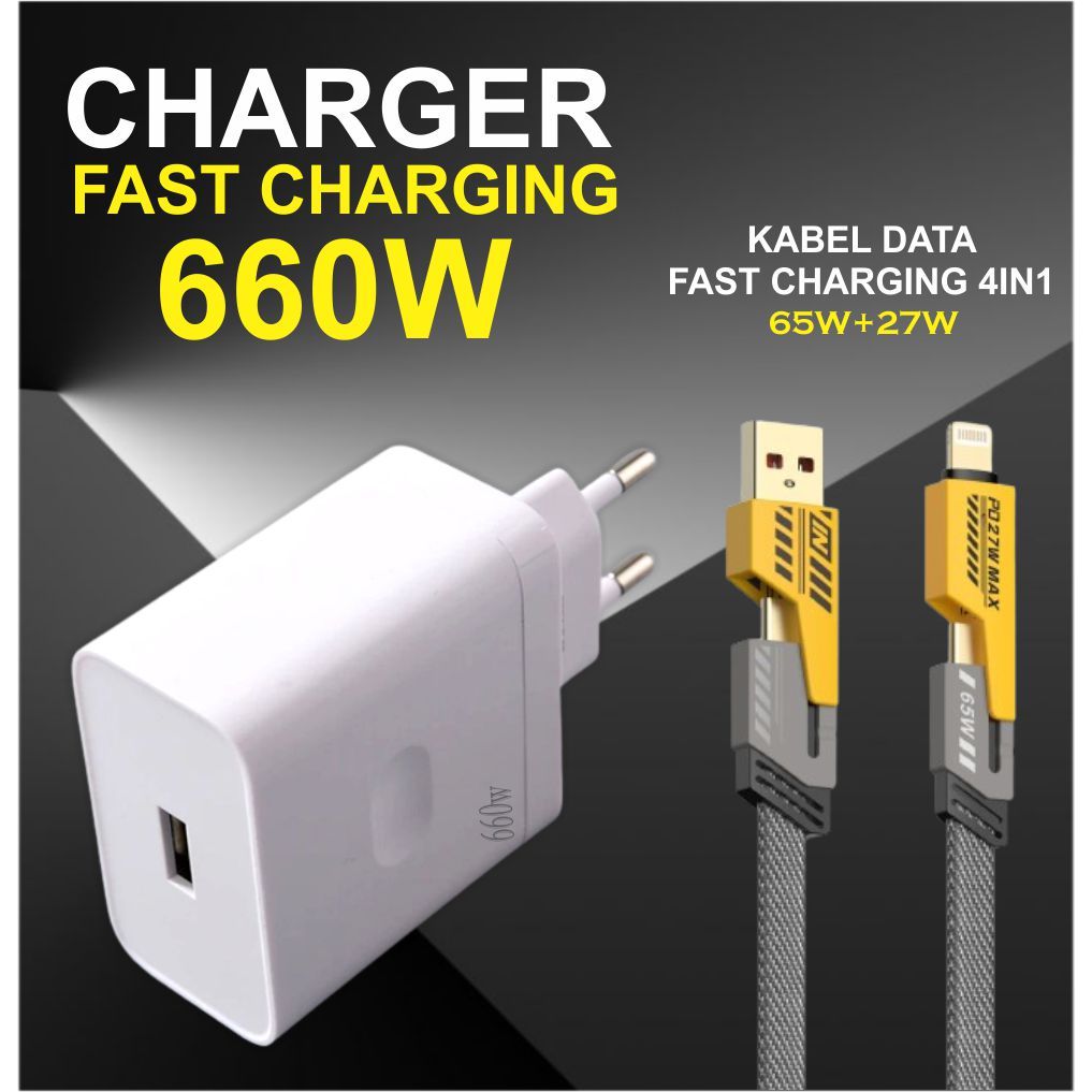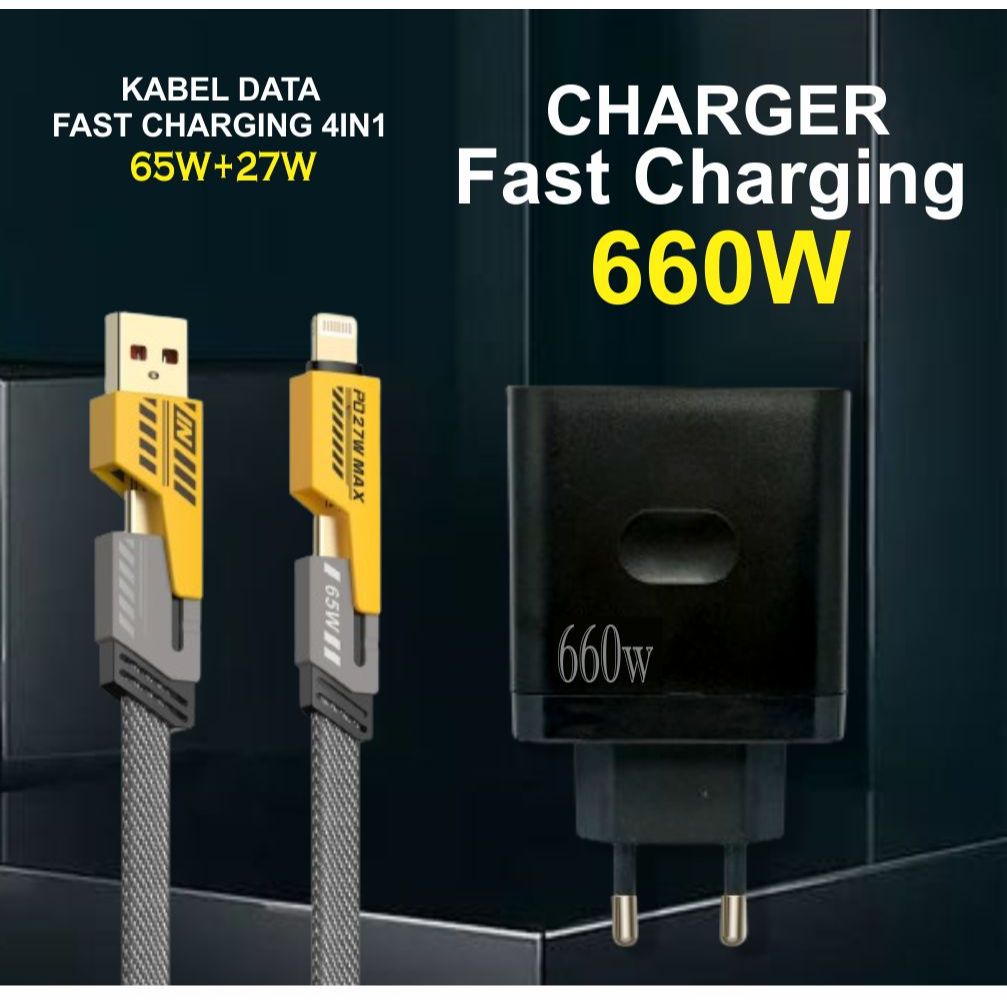 Charger 660W Batok Reno 8 + Kabel Data Fast Charging 4in1 USB Type A, Type C, iOS Multiple Charging