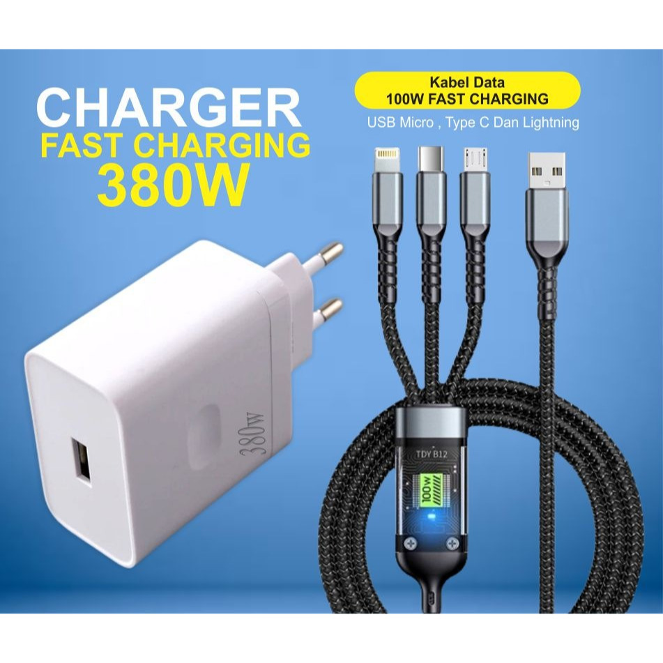 Charger 380W Reno 8 + Kabel Data 3in1 Fast Charging 100W USB Micro, Type C, Lightning Best Quality