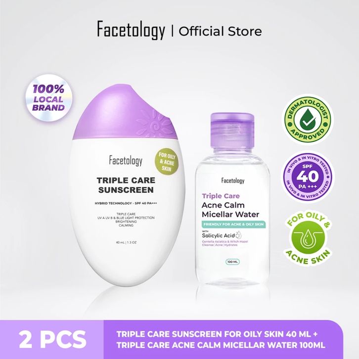 PAKET PROMO Facetology Triple Care Acne Calm Micellar Water 300ML & Triple Care Sunscreen SPF 40 PA++ 40ML & Triple Care
