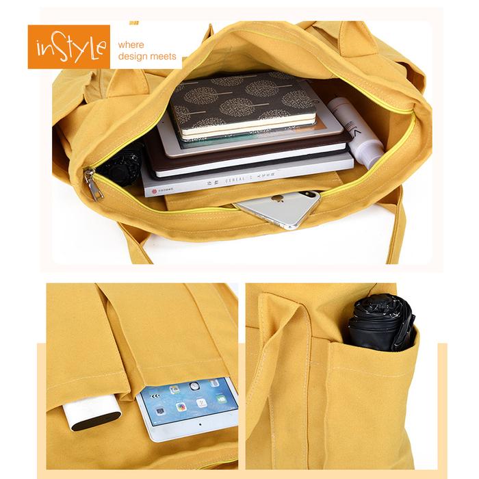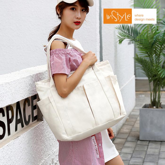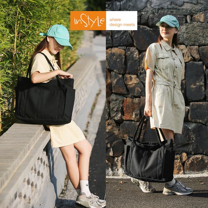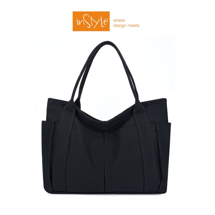 Tas Bahu Kanvas Wanita Tote Bag Jumbo Besar Korea Style (T6-004) canvas hitam totebag - Hitam