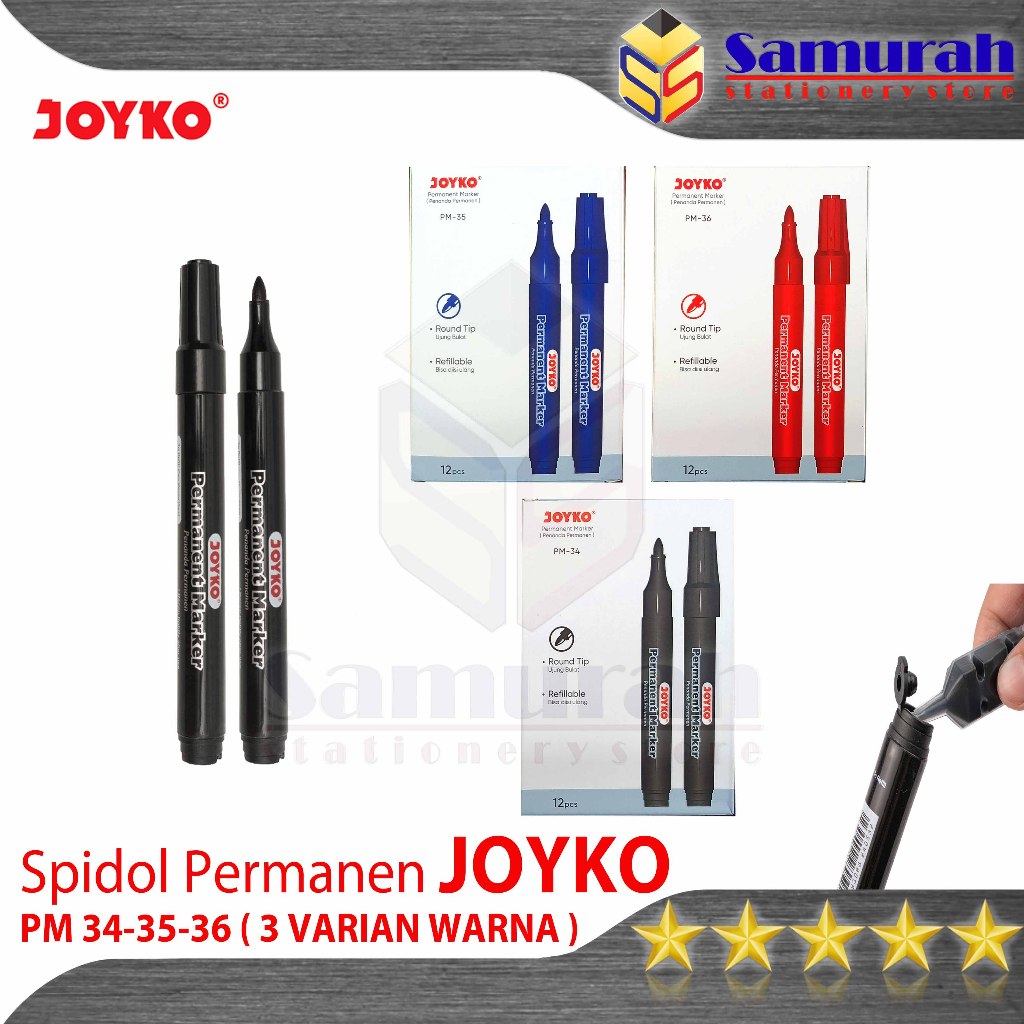 Spidol Permanent Marker Joyko PM 34 Hitam / Pm 35 Biru / PM 36 Merah Bisa Refill isi Ulang - Per Lusin